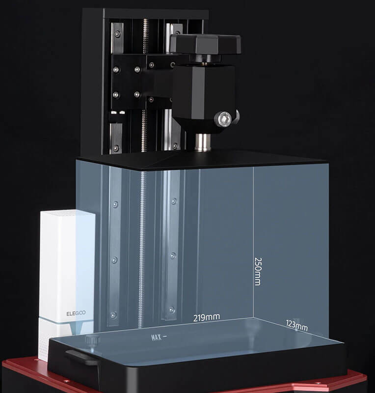 Elegoo Saturn 2 8K предлагает зону построения с габаритами 219×123×250 мм. Это на 43% больше, чем у первой модели Saturn. Для технологии SLA это много, и с такими параметрами пользователь может создавать достаточно крупные изделия за один цикл. Цельнометаллическая ванна для смолы надёжно предотвращает соприкосновение разделительной прокладки PFA с рабочей поверхностью. В свою очередь, прокладка PFA упрощает удаление модели после печати и снижает натяжение плёнки.