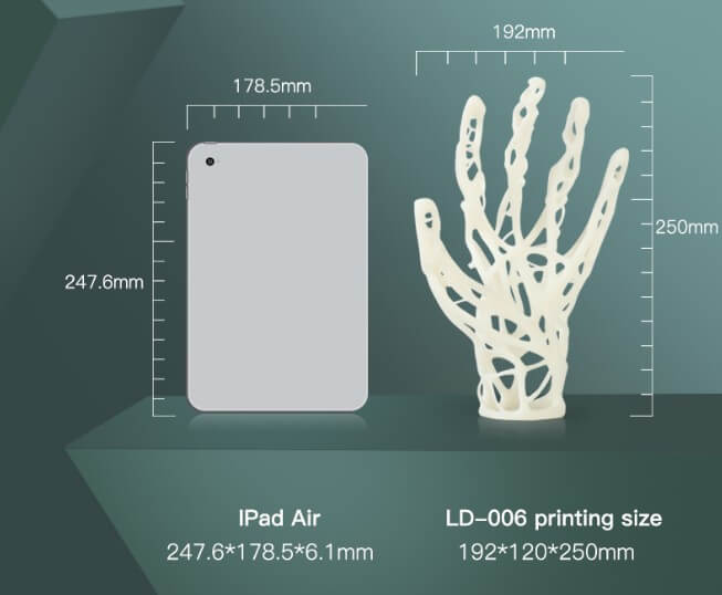 В Creality LD-006 используется новая монохромная матрица с диагональю 8,9 дюйма, и её вполне достаточно, чтобы печатать достаточно габаритные изделия. Область построения у этой модели — 192×120×250 мм. Это конечно не рекорд, но в своём классе это вполне объёмная зона печати. Новая монохромная матрица имеет впечатляющий срок службы — в среднем 2000 часов, что вчетверо больше, чем у цветных.