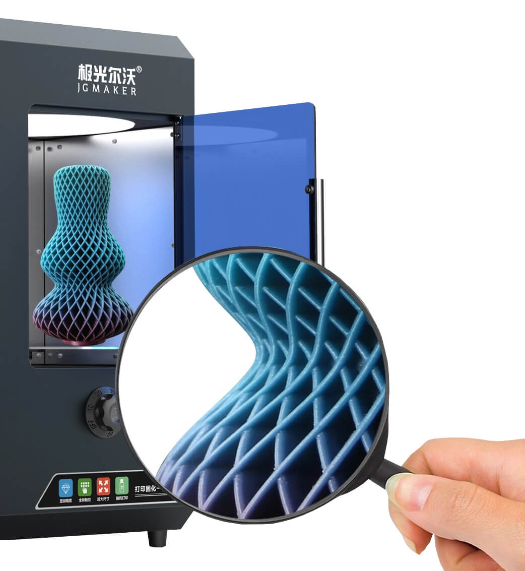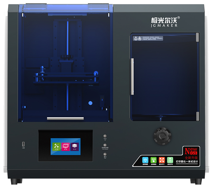 3D принтер JGMaker G5 высококачественное гибридное решение, в принтер встроена УФ-камера что позволяет сэкономить на вашем столе место. Отличительная черта модели автоматическая система налива фото полимера, вам не придется постоянно контролировать процесс печати особенно больших изделий. Установлена система автоматической очистки от остатков полимера в ванной. Автоматическая система калибровки дает процесс удобнее и доступней. Данное пятое поколение принтера дает высокодетализированную печать с высокой повторяемость моделей. Принтер оснащен удобным цветным сенсорным дисплеем, что упрощает взаимодействие пользователя с ним. У модели цельнометаллический корпус и рама принтера позволяет печатать более стабильно.