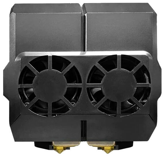 Экструдер — это то, что сразу выделяет QIDI Tech i-Fast на фоне конкурентов. Стандартная версия оснащается экструдером с двумя соплами. Ещё одна версия данного принтера комплектуется одинарным экструдером, который имеет максимальную температуру 300 градусов, что сразу расширяет список термопластиков, с которыми можно работать. Помимо непременных PLA и PETG сюда входят ABS, разновидности TPU, а также Nylon, PC, Carbon fibre и другие конструкционные материалы. Версия с двумя соплами позволяет осуществлять двухцветную печать или использовать PVA и HIPS для создания растворимых поддержек. В модификации с высокотемпературным экструдером предусмотрено рубиновое сопло, которое легко выдерживает повышенную температуру экструзии и не боится абразивного воздействия, обеспечивая качественную печать. Точность печати составляет 0,05 — 0,2 мм. Принтер комплектуется датчиком окончания филамента, что, несомненно, делает печать более удобной — особенно, когда речь идёт о габаритных деталях.