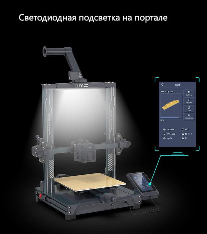 Предусмотрена подсветка модели. Светодиодная лента может включаться и выключаться нажатием кнопки на экране, что удобно для наблюдения за процессом печати модели в при недостаточном освещении.