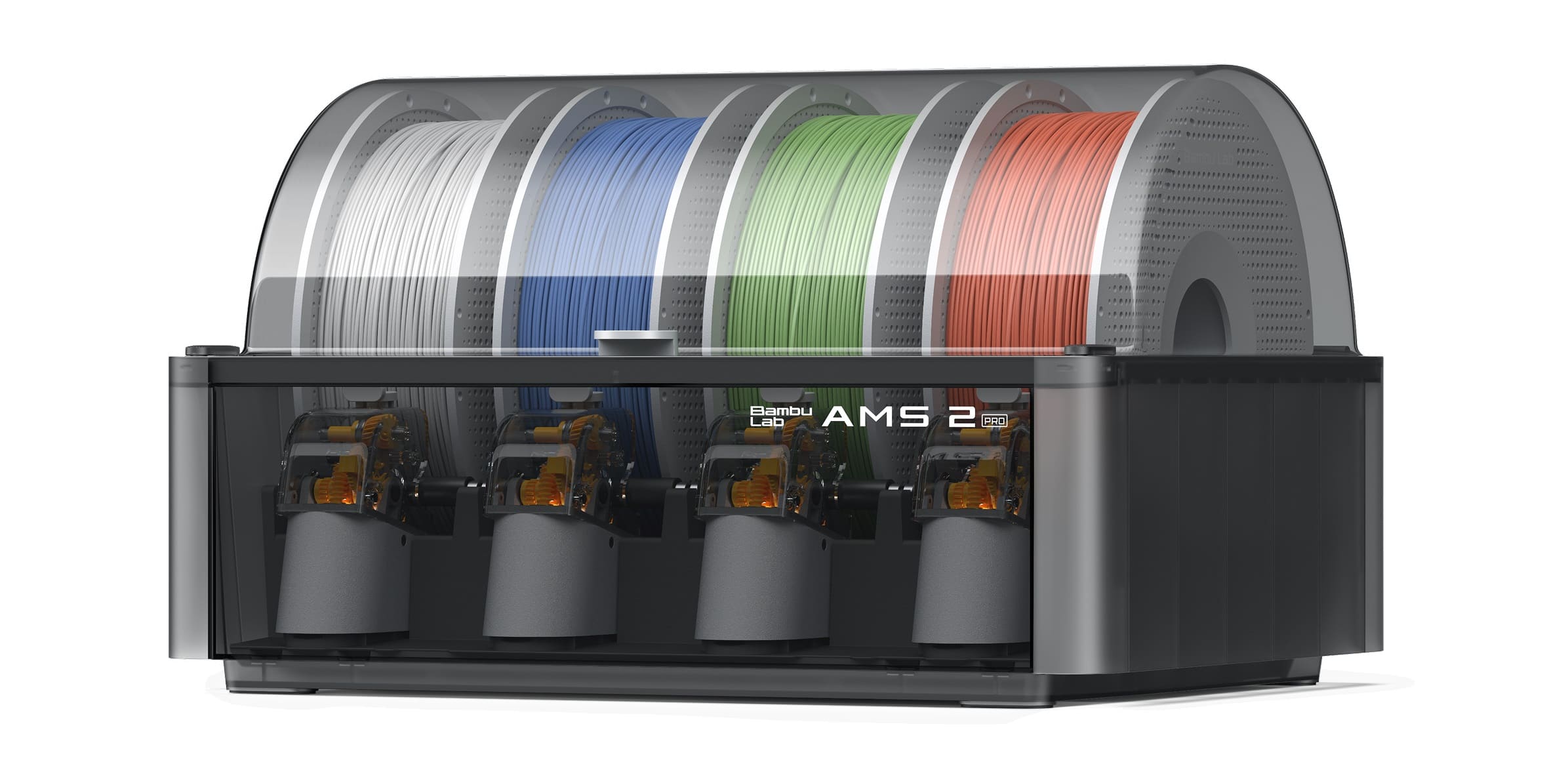 AMS 2 Pro оснащена функцией сушки филамента при температуре до 65 °C, электромагнитным воздушным клапаном для герметизации и вентиляции, а также бесщёточным двигателем подачи, обеспечивающим на 60% более быструю подачу по сравнению с предыдущим поколением AMS.