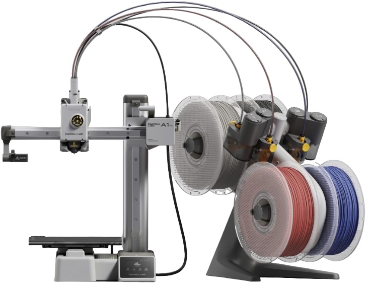 В комплект входит фирменная система Bambu Lab AMS, поддерживающая печать с до четырёх цветов одновременно. Автоматическая загрузка и выгрузка нитей полностью исключают ручное вмешательство в процессе многоцветной печати. При необходимости можно легко переключиться на работу с одной катушкой.