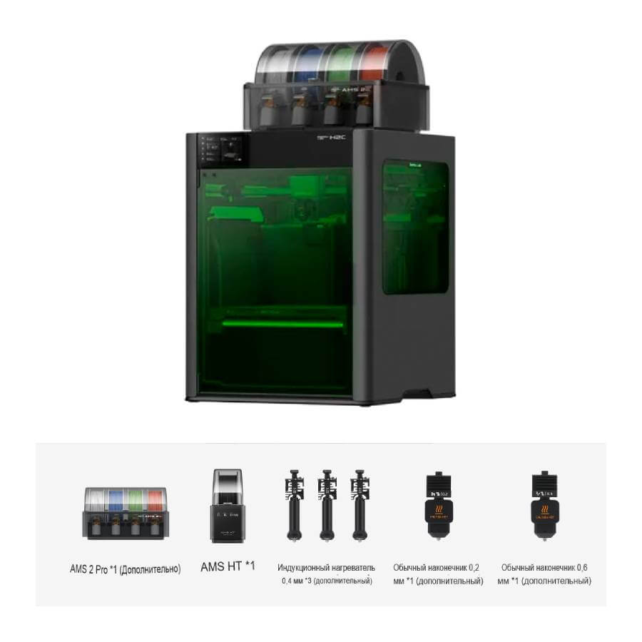 Bambu Lab H2C поставляется полностью готовым к работе — комплектация включает всё необходимое для быстрого старта. Принтер поддерживает гибкие сценарии сетевого взаимодействия: