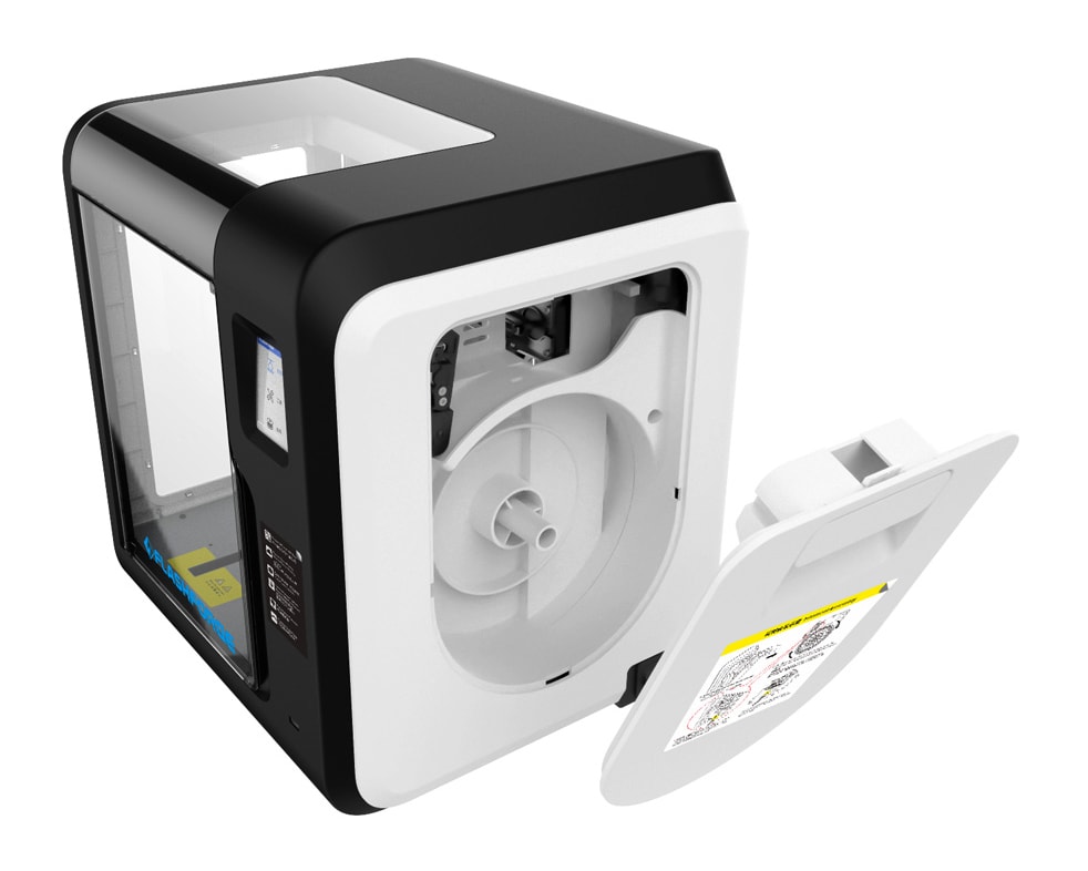 Корпус выполнен из пластика. В правой его части установлен встроенный картридж для автоматической подачи нити на экструдер. Рабочая область является закрытой, с одним акриловым окошком и дверцей. Область печати у принтера вполне достаточная для любительского уровня – 150х150х150 мм. Стол является подогреваемым, с максимальной температурой 100 °С, что при некоторых настройках позволяет использовать пластик ABS.