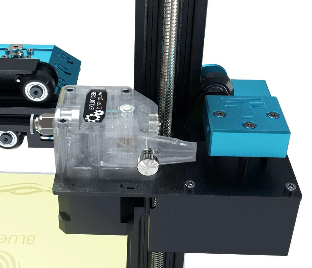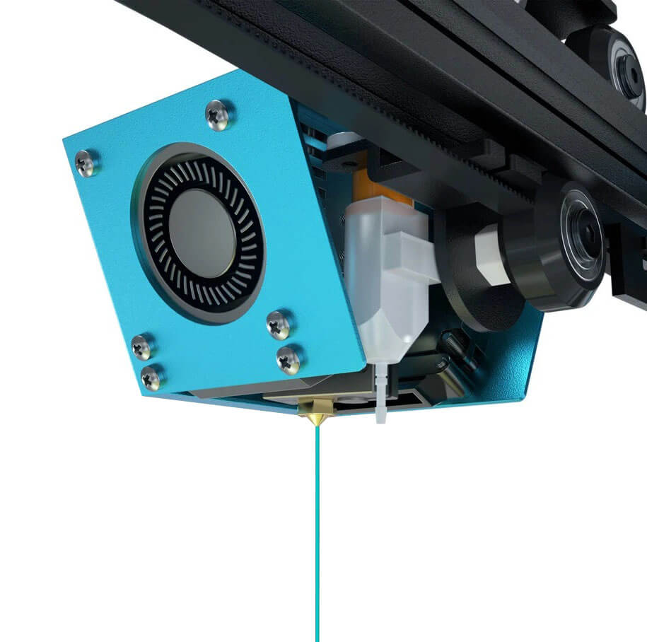 В этой модели применяется BMG-экструдер с металлическим корпусом, двойным обдувом, максимальной температурой 260 °C и стандартным диаметром сопла форсунки 0.4 мм. Для повышения точности печати был применён двигатель с шагом 0,9 °, а датчик обрыва нити и функция автовозобновления печати заметно упрощают работу с принтером. В сочетании с горячим столом всё это позволяет эффективно использовать самые популярные виды расходных материалов: ABS, PLA, PETG, Wood и другие.