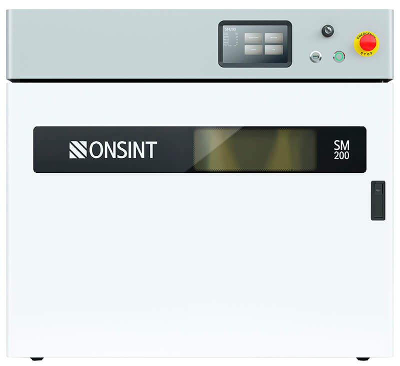 3Д принтер ОНСИНТ СМ200 имеет объём печати 230 х 230 х 230 мм и позволяет создавать детали с габаритами до 200 х 200 х 200 мм. В нём применяется мощный 30Вт CO2 лазер IV класса и высокоточная сканаторная система, которая обеспечивает великолепное качество поверхности готовых изделий и скорость печати до 20 мм/ч. Поскольку термопластичным полимерным порошкам требуется стабильная температура для всего рабочего слоя принтер обеспечивает равномерную термостабилизацию объёма печати. Он имеет пять зон нагрева от 90 °C до 190 °C, которые контролируются пиромерами. При необходимости можно установить систему нагрева повышенной мощности с температурой до 250 °C для работы с конструкционными материалами.