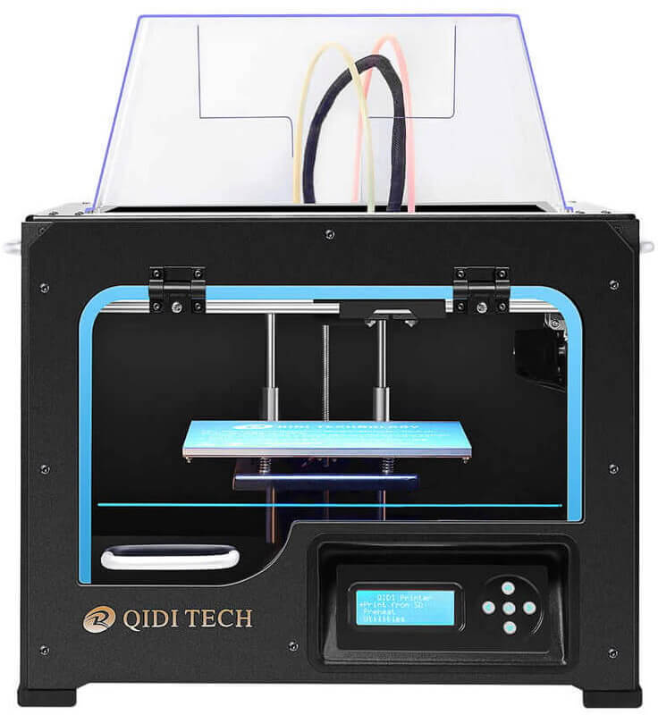 3D принтер QIDI TECH I имеет корпус закрытого типа, жёсткий металлический каркас, а его изюминкой является двойной экструдер из алюминия. Его максимальной температуры 250 ℃ достаточно для работы как с PLA или PETG, так и с более требовательным к условиям печати пластиком ABS. Наличие двух печатающих головок позволяет печатать двумя цветами или двумя материалами, а также применять PVA и HIPS для создания растворимых поддержек.