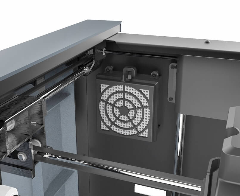 Разработчики применили ещё одно нововведение. Оно не влияет напрямую на качество печати, но делает работу с принтером более комфортной, чем раньше. В конструкцию Guider 2s добавили воздушный фильтр и вентилятор для очистки воздуха от токсичных паров. Мейкеры, которые часто имеют дело с ABS и подобными ему пластиками, наверняка оценят эту функцию.