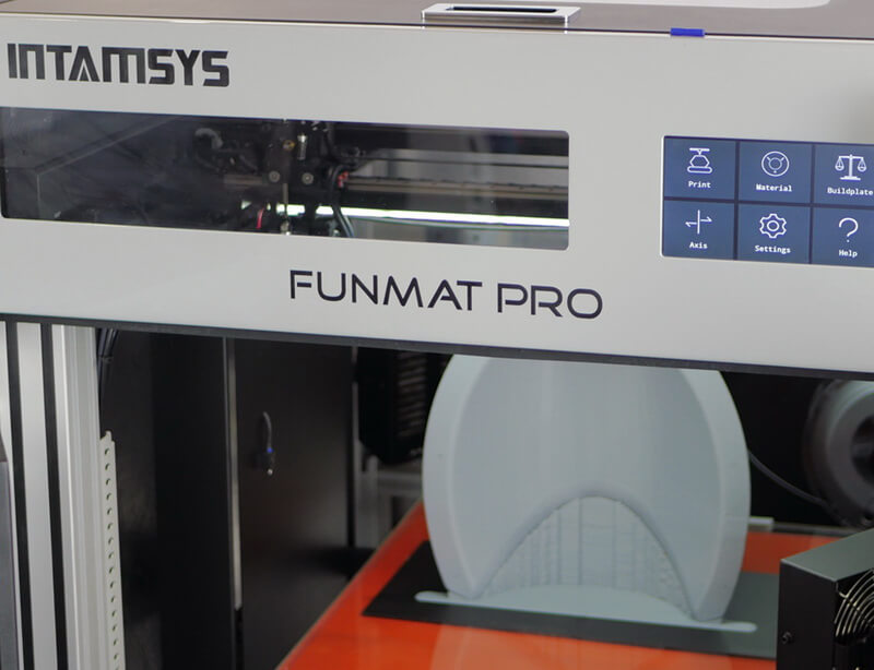Экструдер Intamsys Funmat PRO способен разогреваться до 280 °С, а печатный стол из боросиликатного стекла на алюминиевой платформе — до 120 °С. Платформа имеет функцию быстрого предварительного нагрева, благодаря присутствию особой прокладки из силикона, лучше передающей тепло.