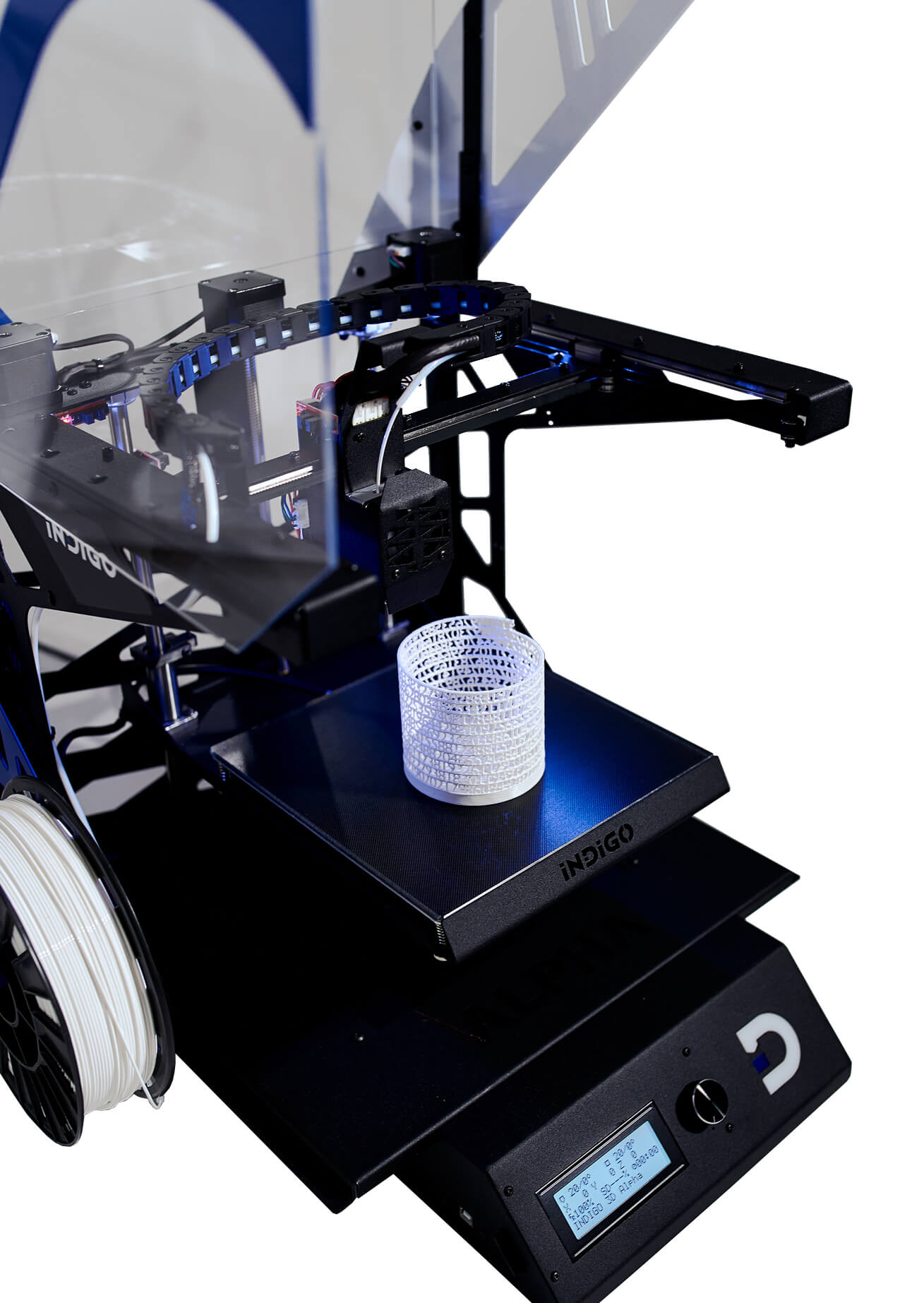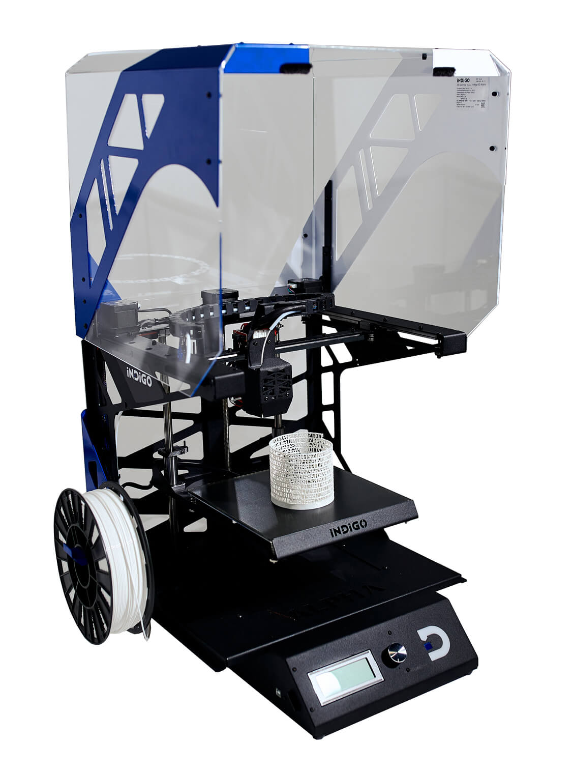 3D принтер INDIGO Alpha в принтер установлен экструдер типа директ, что позволяет без проблем печатать как стандартными материалами так, но и гибкими материалами. Покрытие у печатного стола осуществляет надёжное сцепление модели во время печати и практические ситуаций, когда надо применять дополнительный средства для повышения адгезии. Рама принтера стальная с высокой жесткостью, прочностью и минимальной вибрацией. Благодаря тому что корпус принтера сделан из акрила, принтер получился облегчённым.