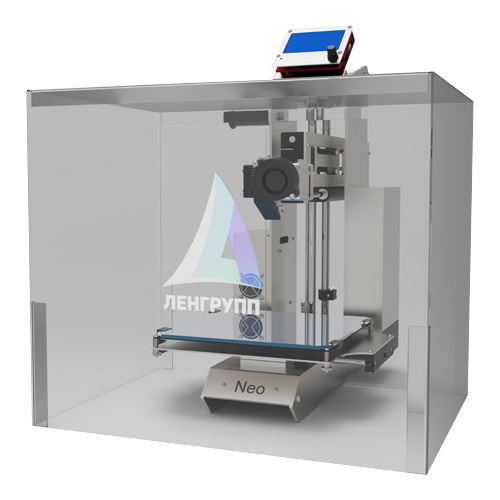 На первый взгляд кажется, что 3D принтер ЛенГрупп NEO — это классический FDM-принтер с открытым корпусом. Однако задача улучшения терморегуляции в этой модели решена очень элегантно. В комплекте идёт колпак из оргстекла с габаритами 530×300×400 мм. Он стабилизирует температуру при печати и позволяет полноценно использовать такие пластики, как ABS и Nylon.