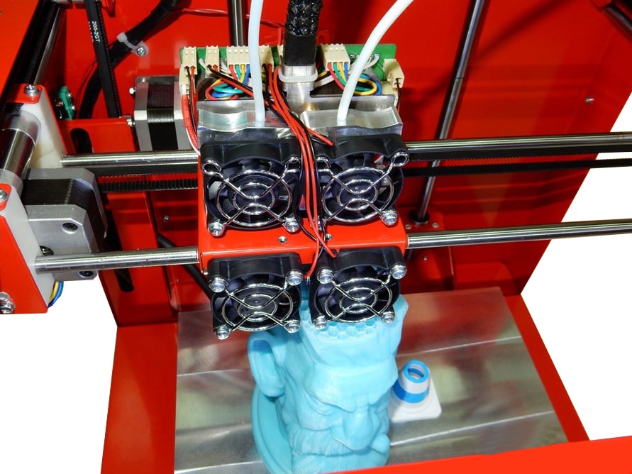 Машина оснащена экструдером с двумя печатающими головками, эта система позволяет печатать двумя типами или цветами пластика одновременно.