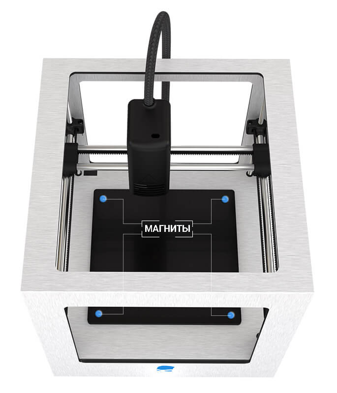 Блок питания, кабель, катушка CyberFiber PLA, держатель катушки, печатный стол MagnetPad, трубка подачи пластика, MicroSD карта |