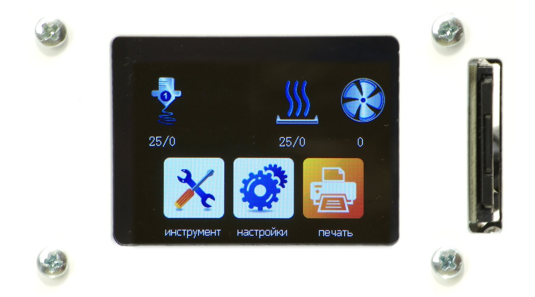 Классические типы подключения через USB или SD, тихие драйверы TMC2208, цветной сенсорный дисплей для удобного управления и контроля процесса, возможность установки катушки 2.5 кг, датчик окончания филамента. Конструкция базируется на жесткой стальной раме из 3 мм стали и мощных рельсах по осям X и Z.