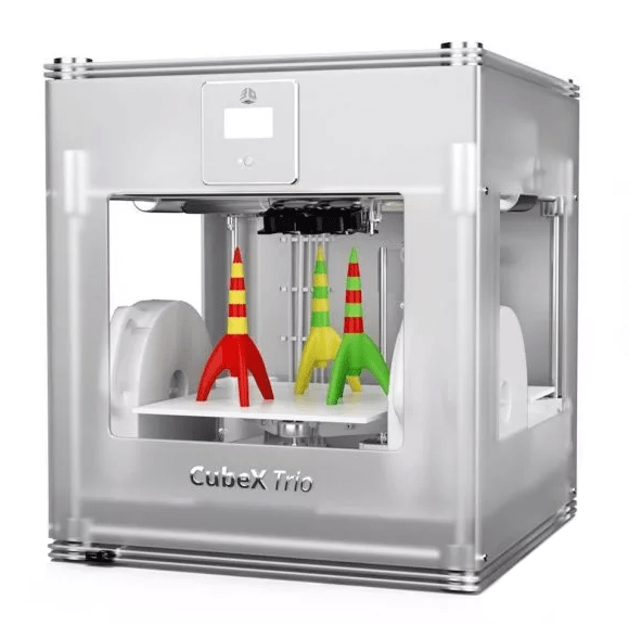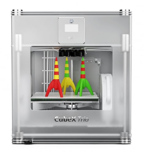 3D принтер CubeX Trio от американского производителя 3D Systems c тремя печатающими головками. Есть возможность печатать материалам поддержки или тремя цветами сразу. У модели большая камера печати, в ней можно уместить несколько изделий. Поддерживается печать только PLA пластиком.