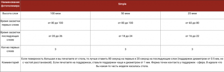 Фотополимер имеет среднюю вязкость, поэтому с ним легко работать на профессиональных и настольных принтерах. Для затвердевания первых трех слоев производитель рекомендует выставлять время засветки 80 секунд, для последующих слоев достаточно всего 20 секунд. При печати больших деталей важно, чтобы какая-либо часть модели обязательно имела точки опоры со столом (часть без поддержек).