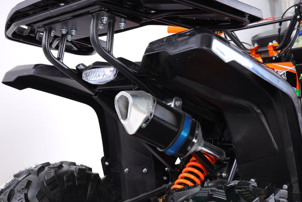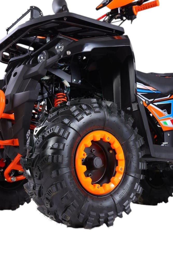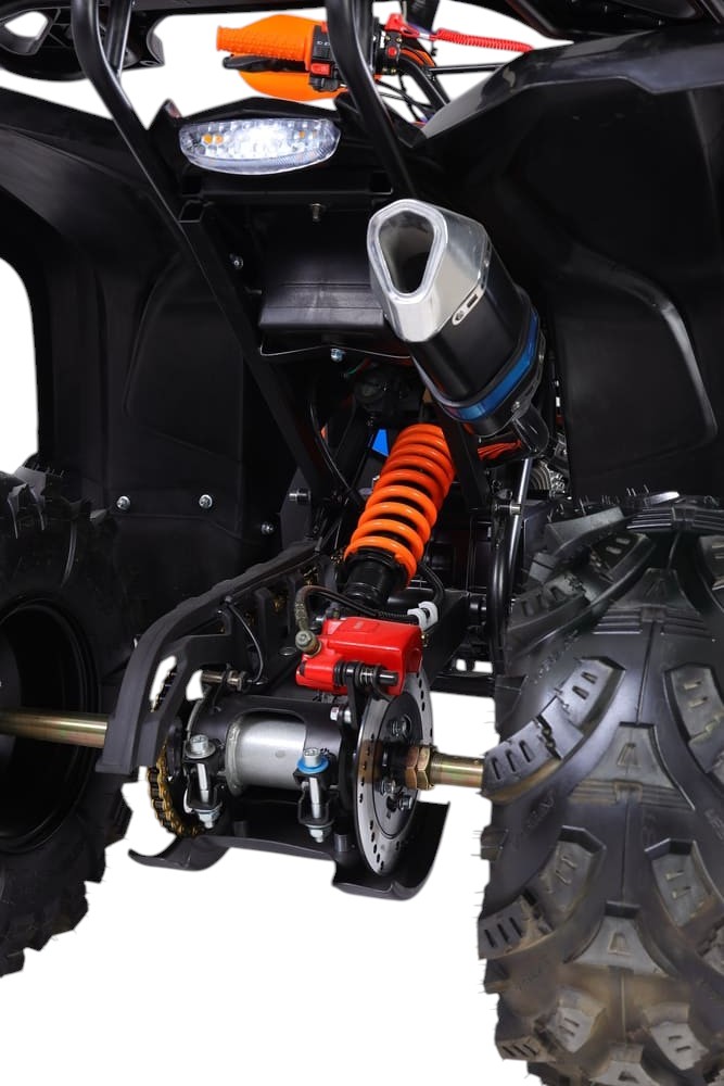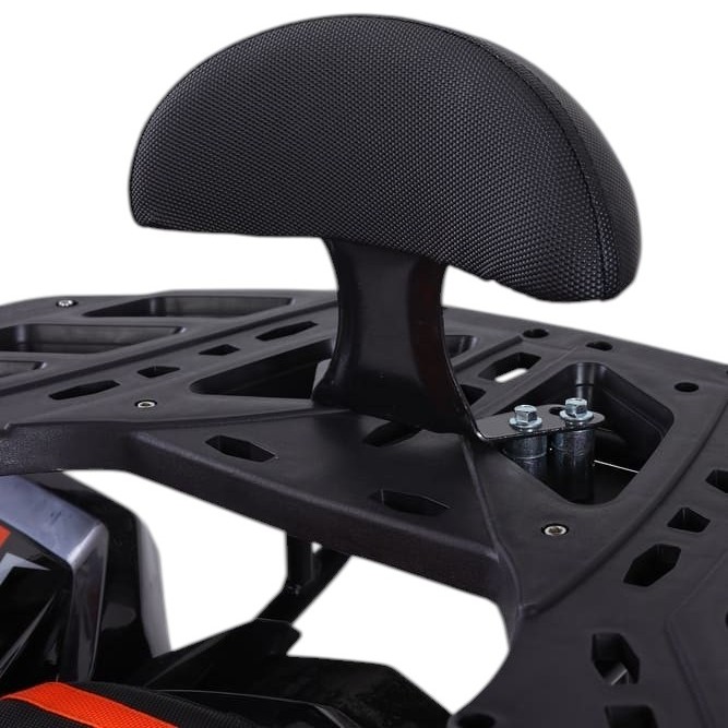 Квадроцикл оснащён вариативной трансмиссией (F-N-R), обеспечивающей плавное переключение между режимами движения вперёд, нейтралью и задним ходом. Привод — задний, что гарантирует хорошую управляемость и эффективную передачу тяги. Максимальная нагрузка составляет 200 кг, а запас хода достигает 100 км на одном баке топлива, что делает модель практичной для длительных поездок по загородным трассам или на дачном участке.