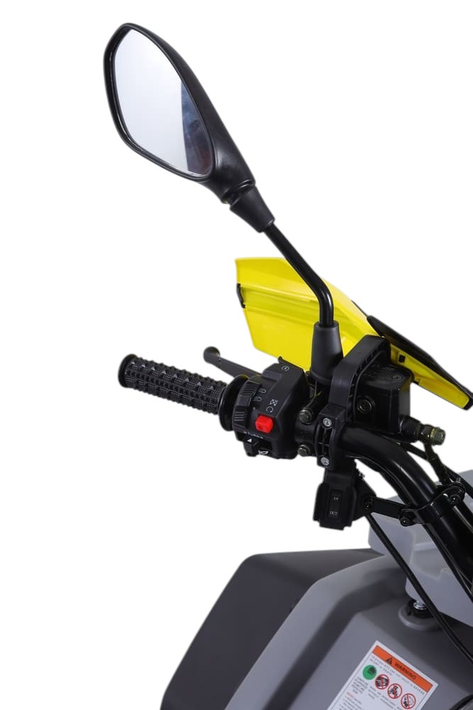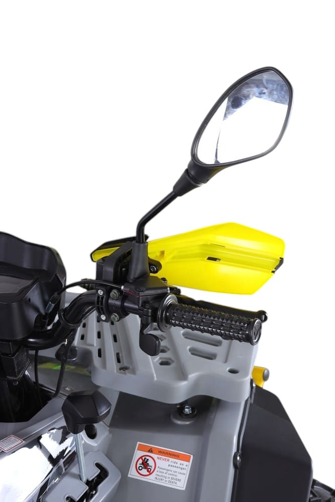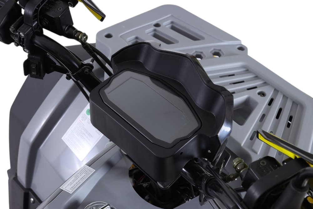 Для безопасности установлены дисковые тормоза спереди и сзади, обеспечивающие мощное и предсказуемое торможение даже на высокой скорости. Подвеска — амортизирующая пружинно-масляная — эффективно смягчает удары от ухабов и выбоин. Колёса большого диаметра — 23 дюйма сзади и 22 дюйма спереди — обеспечивают отличную проходимость, устойчивость и сцепление на любом рельефе.