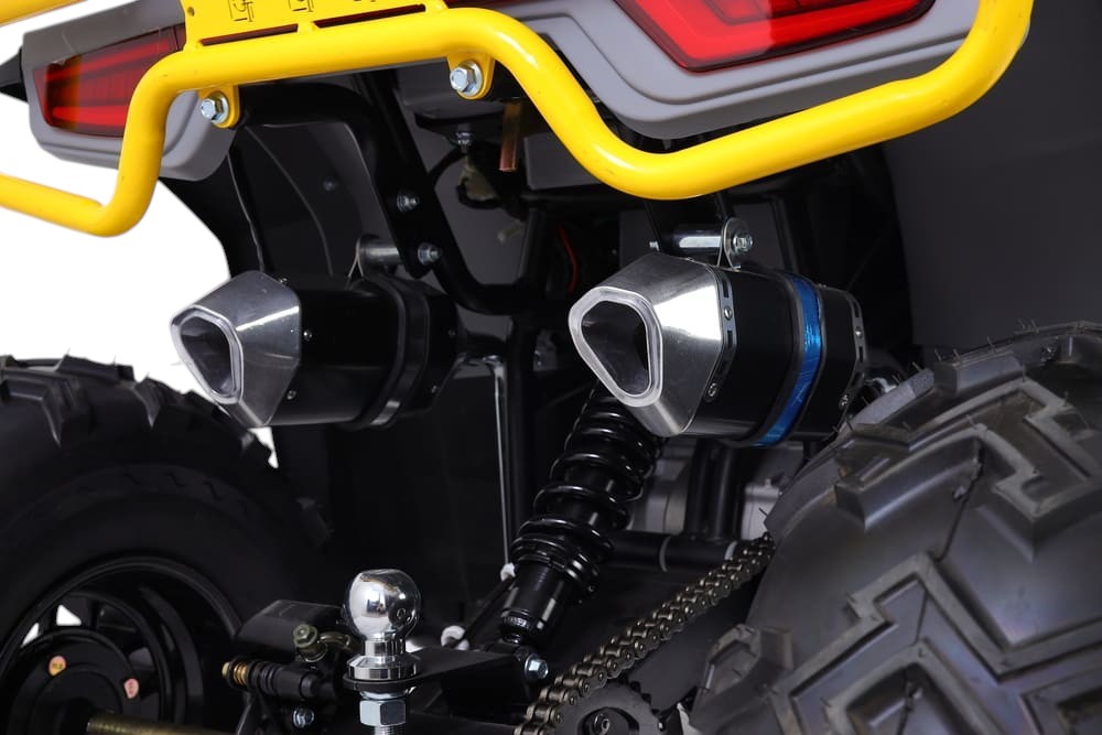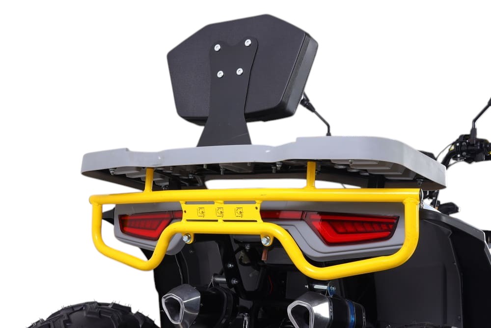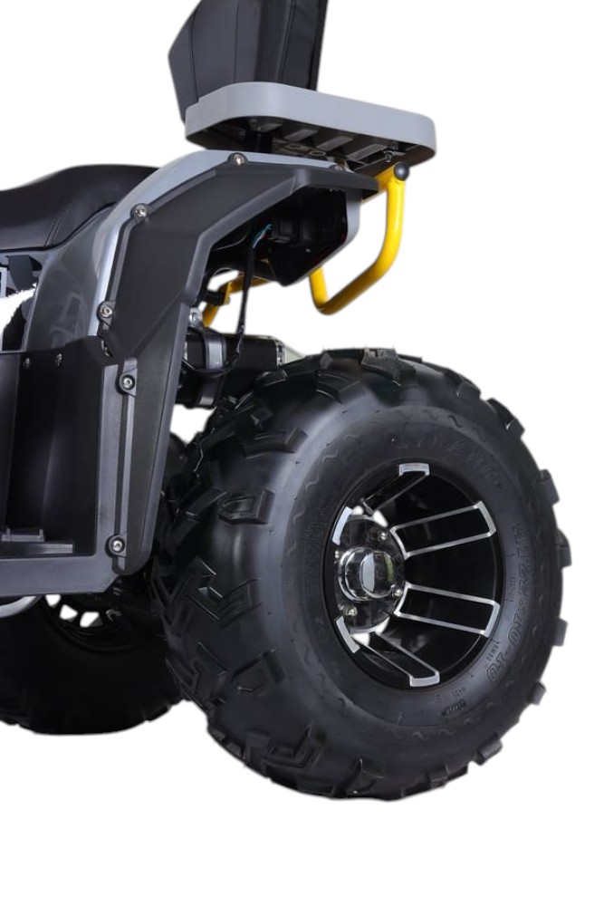 Квадроцикл оснащён вариативной трансмиссией (F-N-R), позволяющей легко переключаться между движением вперёд, нейтралью и задним ходом. Привод — задний, что гарантирует стабильную тягу и хорошее сцепление на грунтовых и скользких покрытиях. Вместительный топливный бак объёмом 6,5 литра обеспечивает продолжительный запас хода, а аккумулятор 12 В / 7000 мА·ч надёжно питает электронные системы, включая LCD-дисплей.