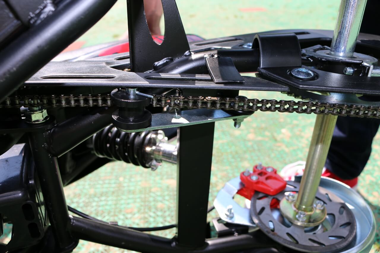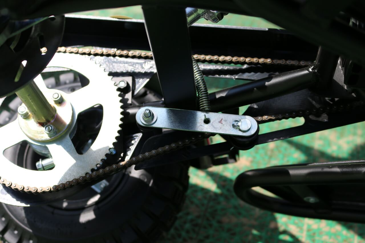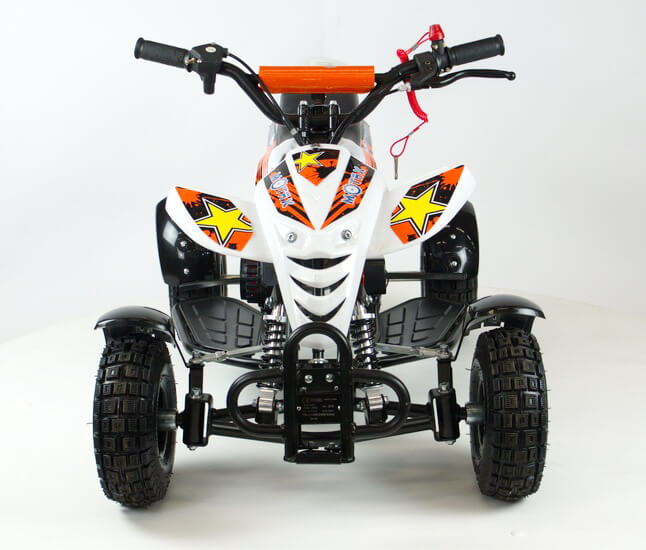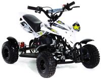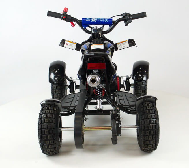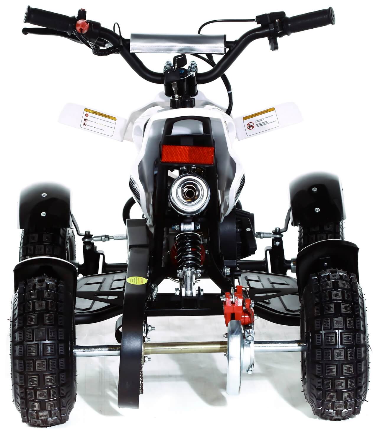 Конструкция квадроцикла базируется на прочной металлической раме с двухподвесной системой: маятниковая передняя подвеска и зависимая задняя обеспечивают комфортное движение по различным типам покрытий. Компактные размеры и вес всего 33 кг делают модель легкой для транспортировки и хранения, не теряя при этом своей прочности и устойчивости. Металлические диски гарантируют долговечность эксплуатации.
