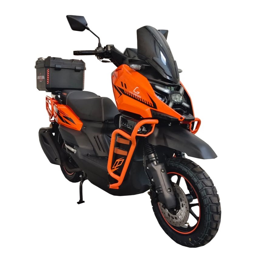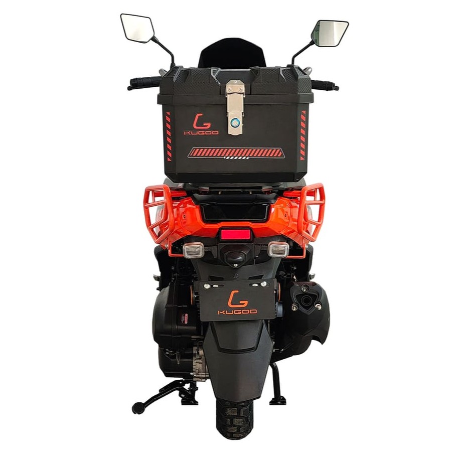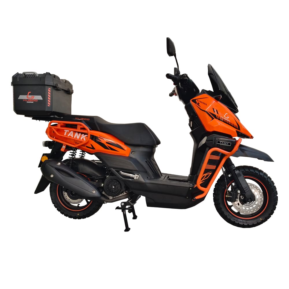 Kugoo Tank — это мощный бензиновый скутер, созданный для уверенной езды в городских и загородных условиях. Оснащённый одноцилиндровым 4-тактным двигателем объёмом 168,9 см³, он развивает мощность 7,0 кВт при 6500 об/мин и крутящий момент 11 Н·м при 5000 об/мин. Максимальная скорость достигает 88 км/ч, а вместительный топливный бак объёмом 7,1 л обеспечивает продолжительные поездки благодаря низкому расходу топлива — ≤354 г/кВт·ч. При весе 119 кг и максимальной нагрузке 150 кг скутер сохраняет маневренность даже с пассажиром или грузом.