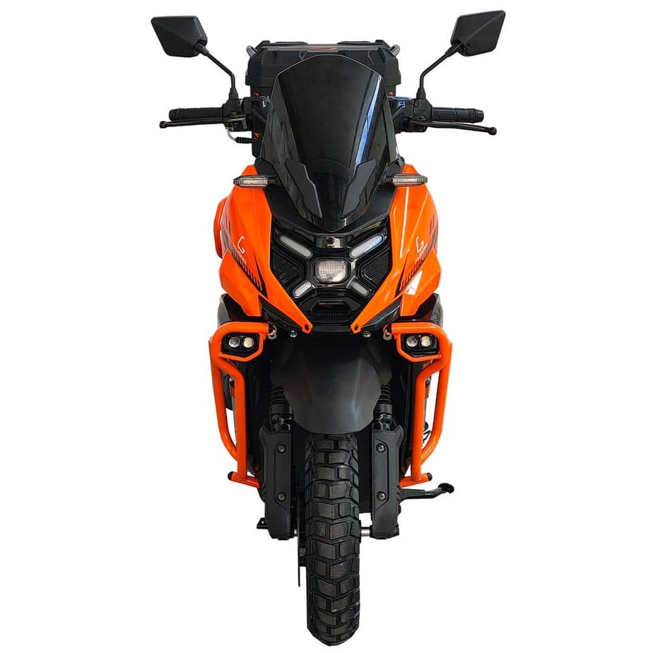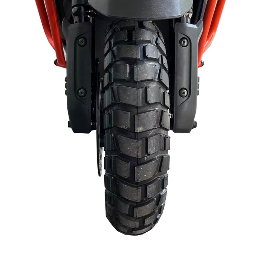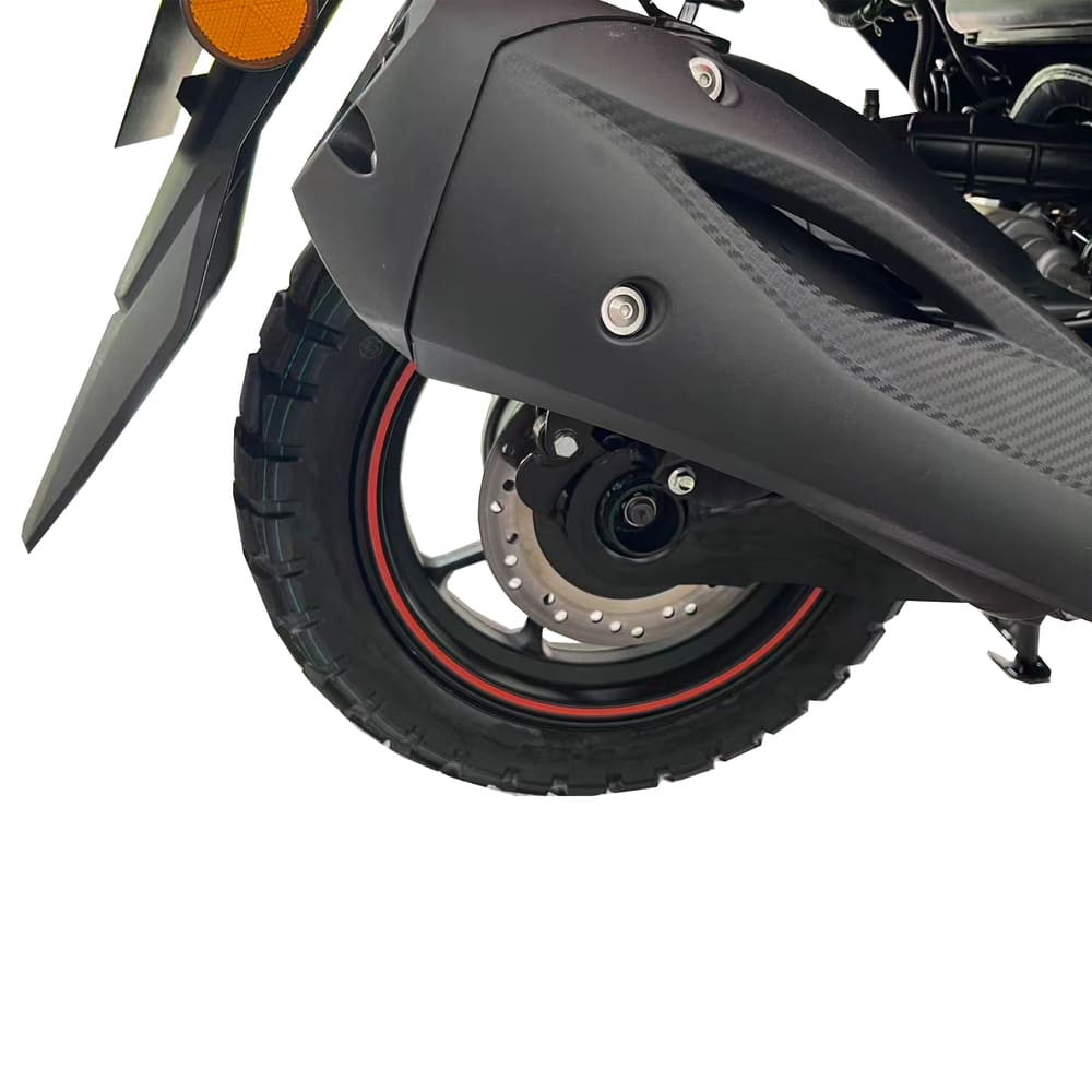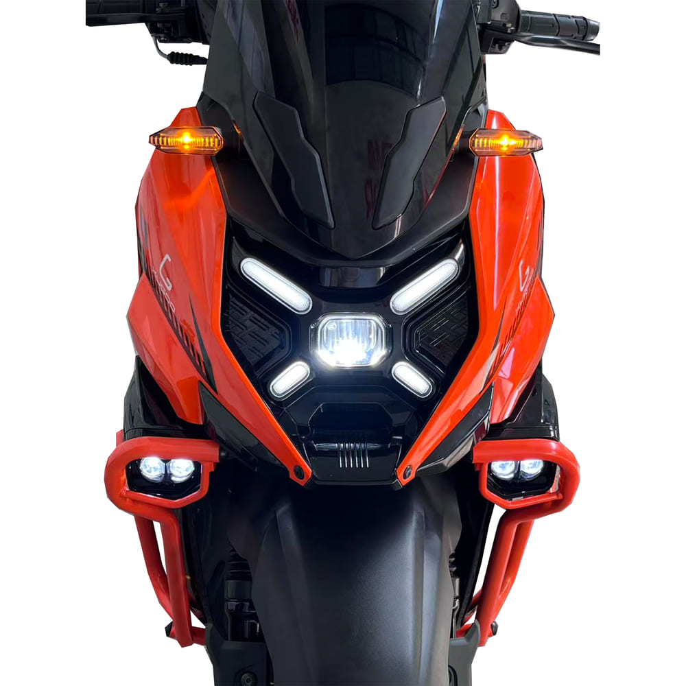 Для безопасности установлены гидравлические дисковые тормоза с усиленными дисками: 230 мм спереди (2 поршня) и 190 мм сзади (2 поршня). Такая система обеспечивает короткий тормозной путь и предсказуемость в экстренных ситуациях. Светодиодная оптика (LED-фара, фонарь и поворотники) повышает видимость в темноте, а цветной VA-дисплей отображает скорость, уровень топлива и диагностические данные. Электроника питается от свинцово-кислотного аккумулятора 12V7Ah, гарантируя стабильную работу всех систем.