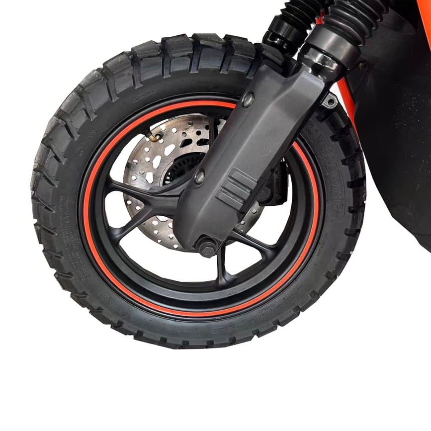 Конструкция скутера сочетает проходимость и комфорт: дорожный просвет 115 мм и ширина руля 725 мм обеспечивают устойчивость на неровных дорогах. Телескопическая гидравлическая передняя подвеска (длина 440 мм) и пружинно-гидравлическая задняя (335 мм) эффективно смягчают удары от выбоин. Колёса размером 120/70-12 гарантируют хорошее сцепление на асфальте и грунте, а высокая высота сиденья 760 мм позволяет комфортно управлять даже на высокой скорости.