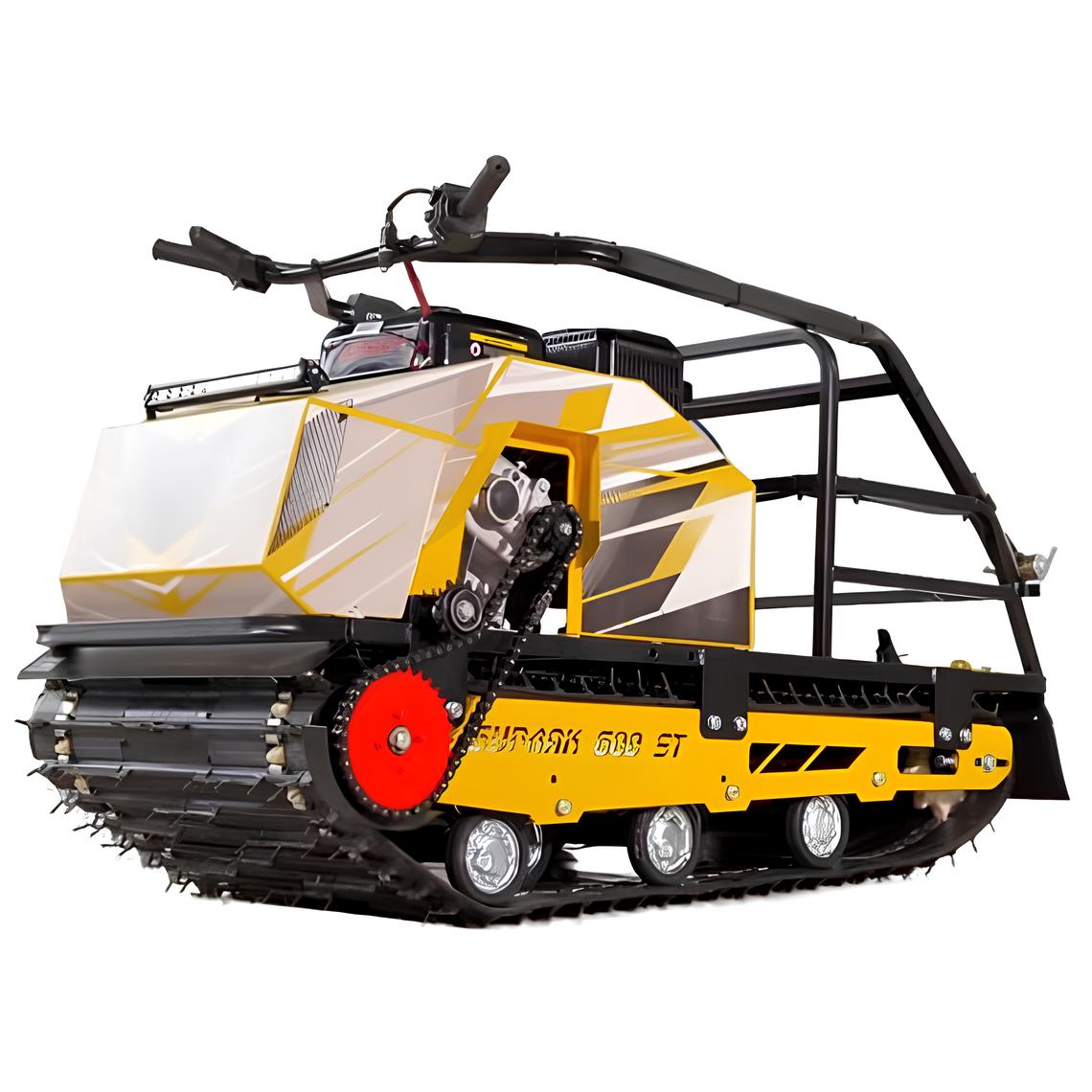 Трансмиссия реализована через надёжный вариатор, обеспечивающий плавное ускорение без рывков. Привод — передний, что обеспечивает эффективное распределение мощности на гусеницу. Максимальная скорость составляет 30 км/ч, что позволяет безопасно и контролируемо передвигаться по заснеженным трассам и болотистой местности. Запуск двигателя возможен как ручным стартером, так и электростартером, что делает его удобным даже в сильные морозы.