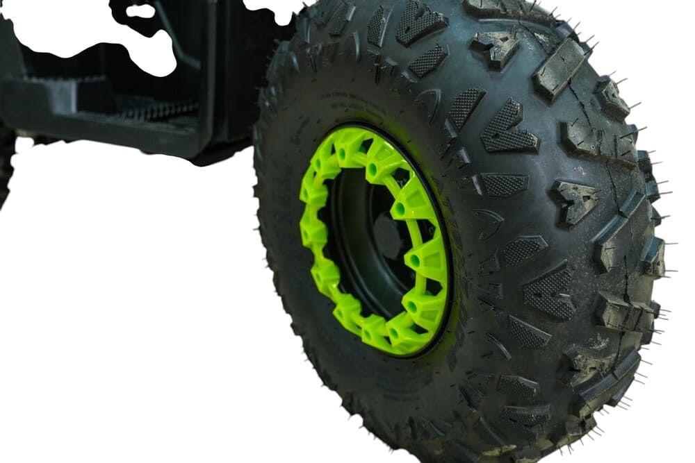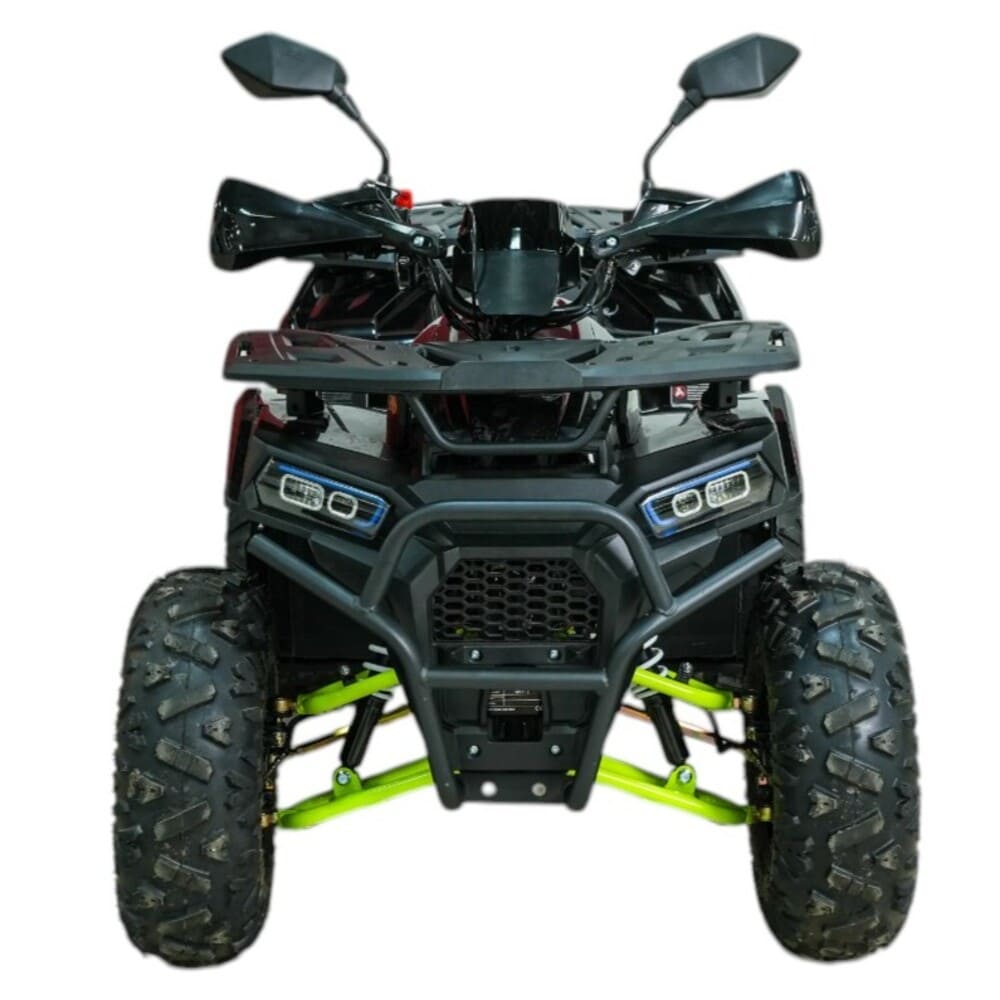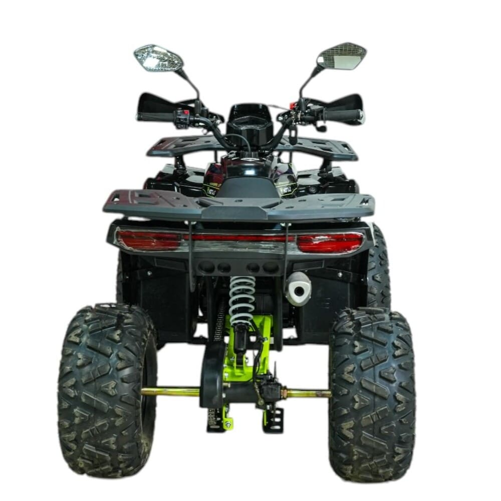 Безопасность движения гарантируется механическими дисковыми тормозами как на передних, так и на задних колесах. Подвеска квадроцикла, состоящая из маятниковой передней и зависимой задней оси, эффективно амортизирует удары от неровностей дороги. Объем топливного бака составляет 3,6 литра, что обеспечивает длительное время работы без необходимости дозаправки. Вес самого транспортного средства равен 120 кг, что делает его устойчивым при движении.