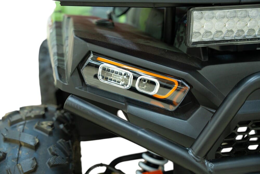 Для комфорта при движении по неровностям установлены двойной рычажный передний амортизатор и моноамортизатор сзади, которые эффективно смягчают удары и повышают устойчивость. Клиренс составляет 11 см, а колёса диаметром 8 дюймов с шинами 19×7-8 (спереди) и 18×9,5-8 (сзади) обеспечивают отличное сцепление на песке, грунте и траве.