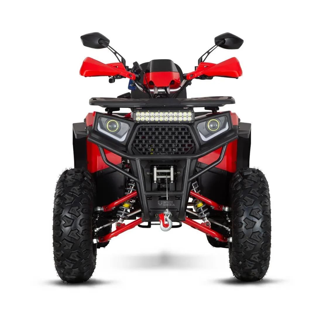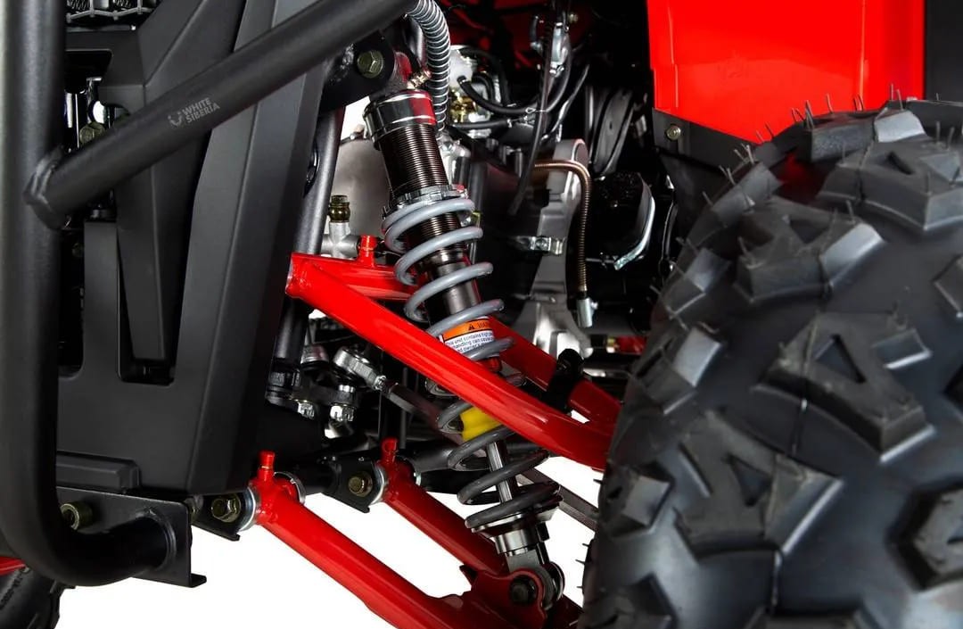 Безупречная проходимость достигается благодаря продвинутой подвеске: двухрычажной шаровой передней системе с двумя амортизаторами и гидравлическому моноамортизатору с регулировкой жесткости сзади. Это позволяет квадроциклу плавно преодолевать неровности дороги и сохранять устойчивость на различных типах поверхностей. Колеса диаметром 10 дюймов, обутые в качественные шины, обеспечивают отличное сцепление с поверхностью, что особенно важно при движении по сложным участкам.