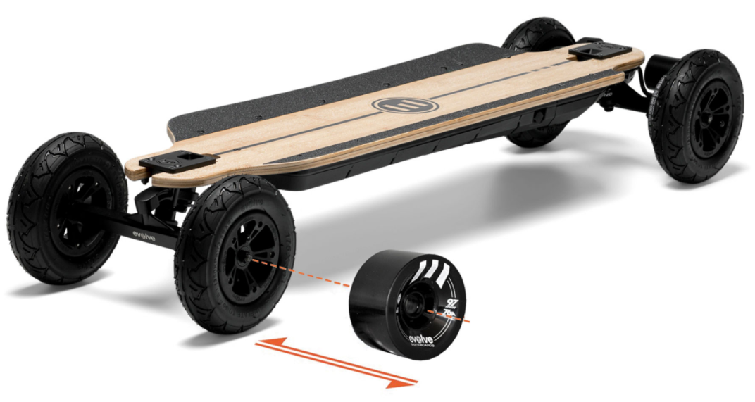 Наши новые литий-ионные аккумуляторы изготовлены по запатентованной технологии PowerFlex на базе лучших батарей типа 18650 - Samsung и Sony. Им под силу проехать до 30 км на одном заряде и превратить ухабистую дорогу или лесную тропинку в бесконечное удовольствие. В сочетании с Bluetooth связью это обеспечивает моментальный разгон и плавное торможение, управление электроскейтом Evolve становится интуитивным. «Сердце» доски – два бесщеточных двигателя общей мощностью 3000 Вт, которые приводят в движение 7-дюймовые пневматические шины повышенной проходимости.