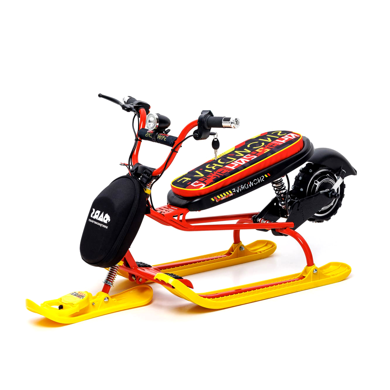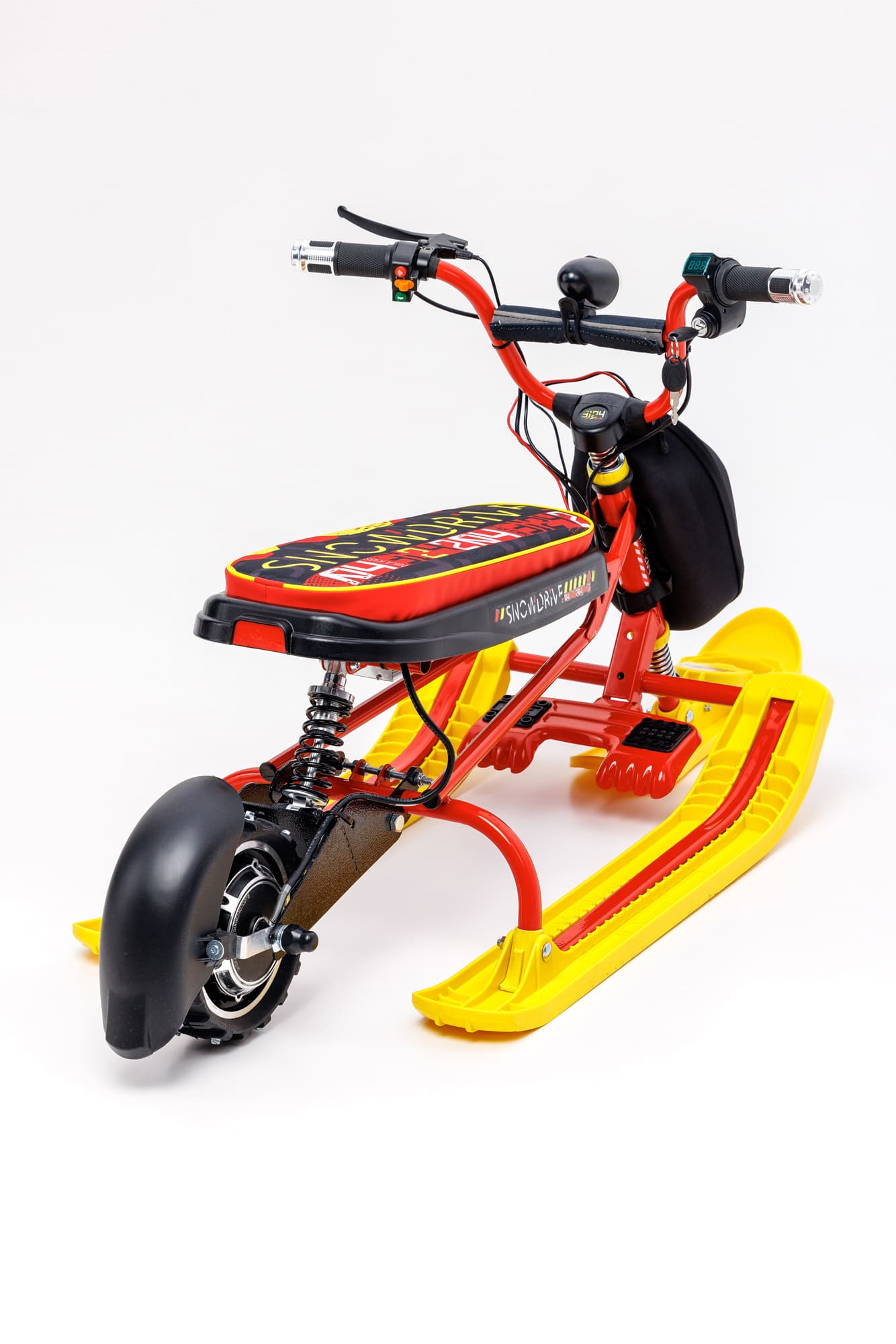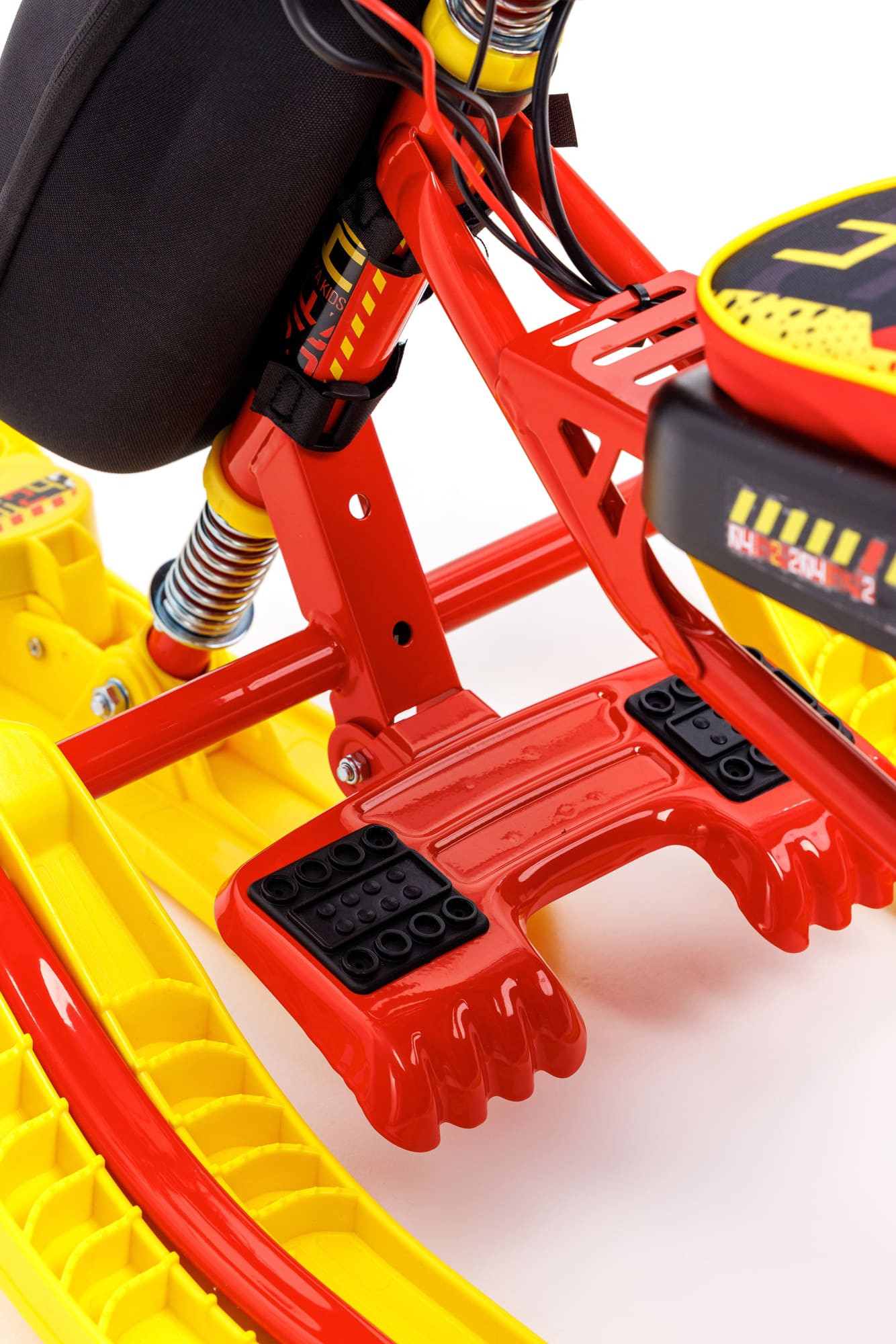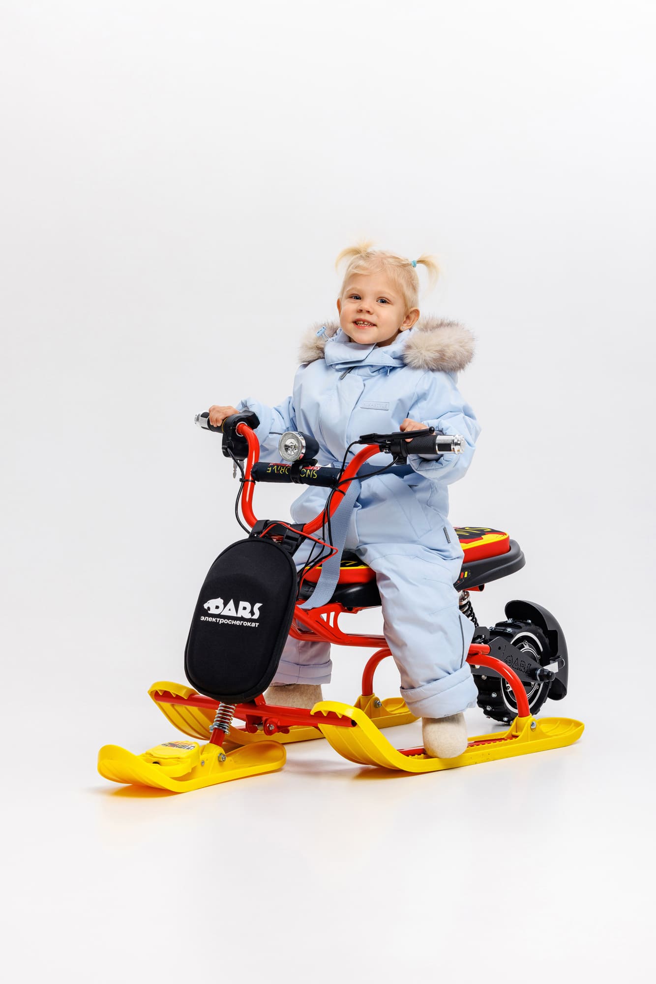 Снегоход имеет заднее колесо с фиксацией, обеспечивающее безопасное спускание с горок, а шипованная покрышка снижает риск скольжения при движении. Велоруль способствует улучшению маневренности, а встроенный фонарик на раме делает поездку безопасной даже в темное время суток.