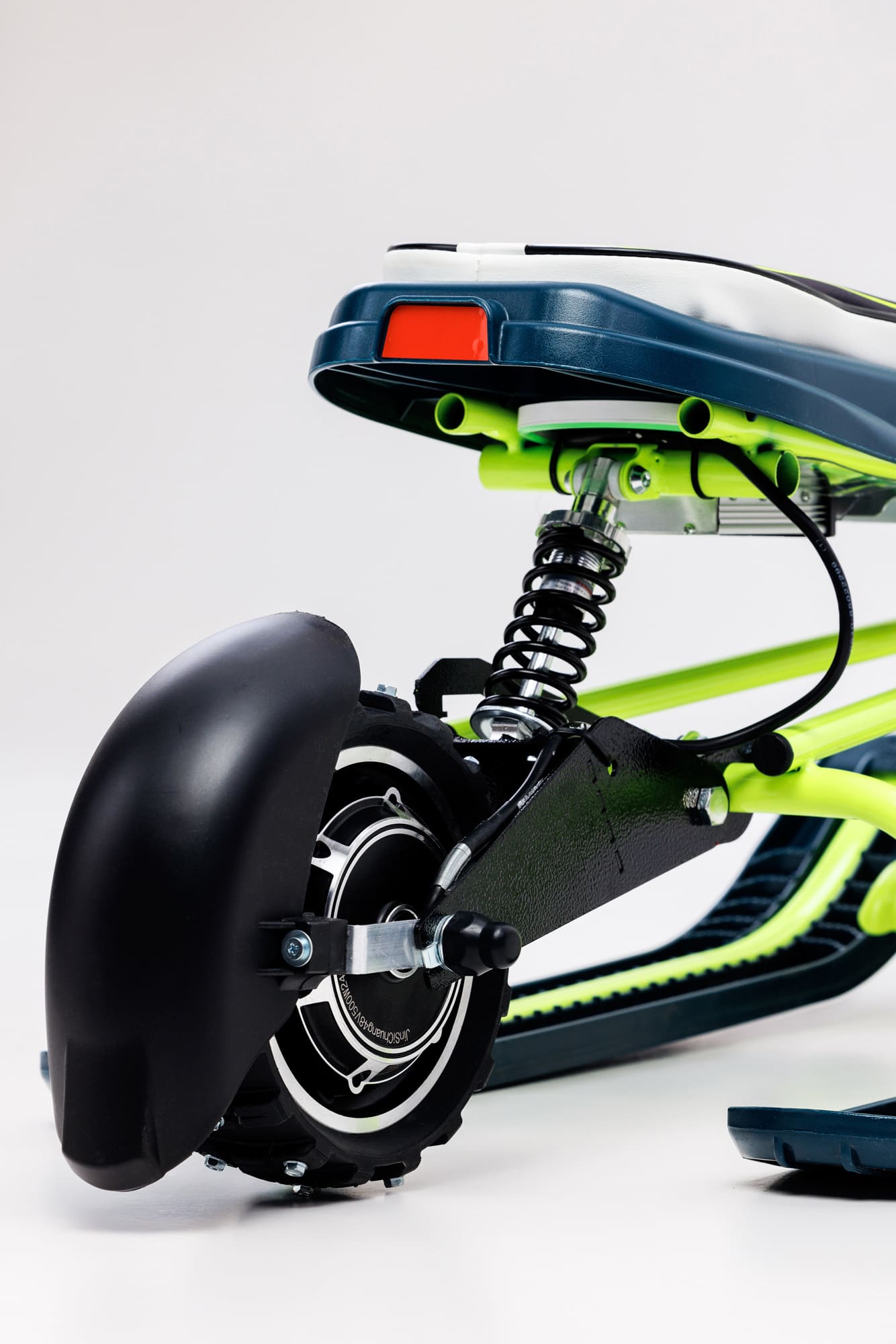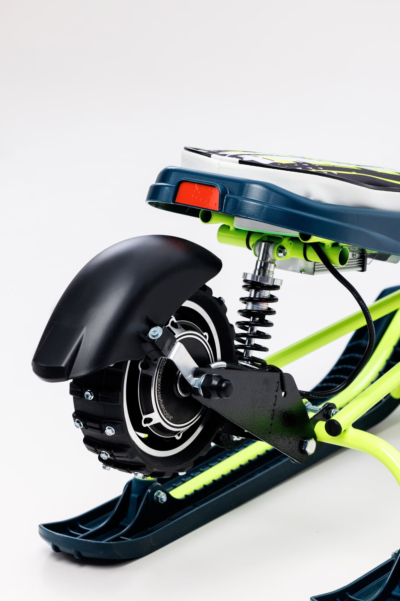 Снегоход имеет заднее колесо с фиксацией, обеспечивающее безопасное спускание с горок, а шипованная покрышка снижает риск скольжения при движении. Велоруль способствует улучшению маневренности, а встроенный фонарик на раме делает поездку безопасной даже в темное время суток.