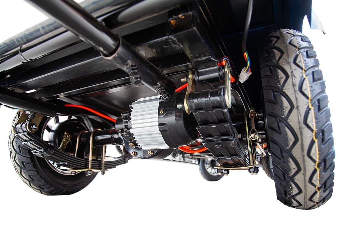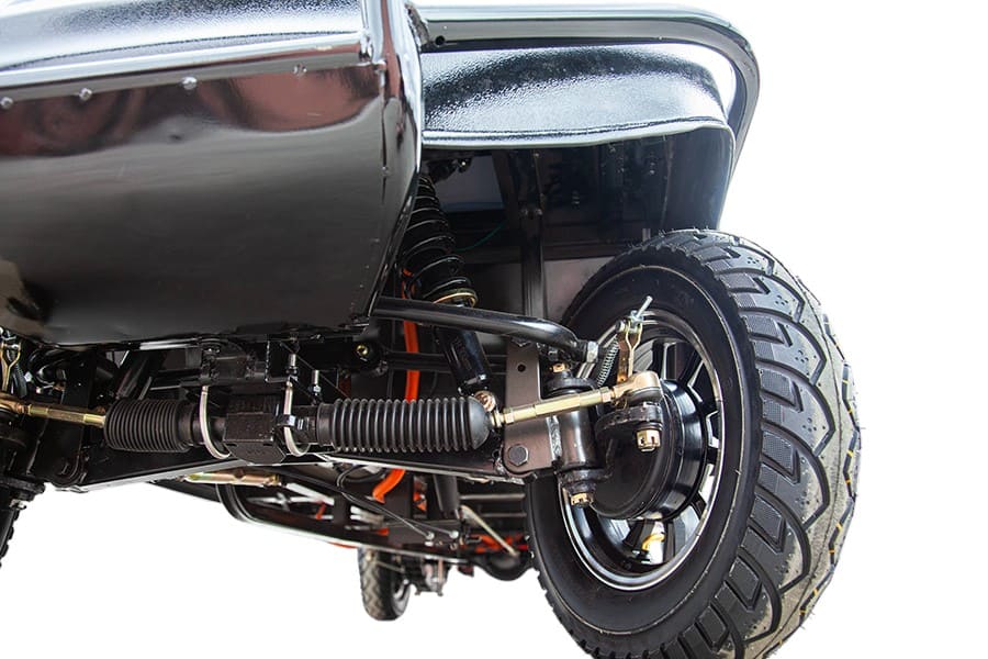 Для комфорта при движении по неровностям установлена рычажная передняя подвеска с амортизацией и рессорная задняя подвеска, обеспечивающие плавность хода и устойчивость. Тормозная система — барабанные тормоза спереди и сзади — отличается надёжностью и долгим сроком службы. Также в комплекте — светодиодные фары и стоп-сигналы, повышающие видимость и безопасность при движении в темное время суток.