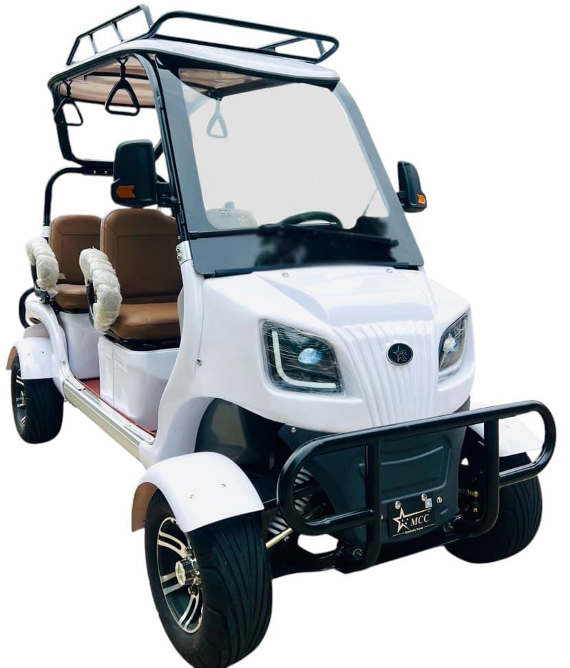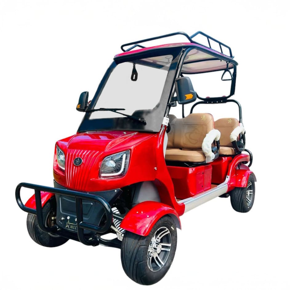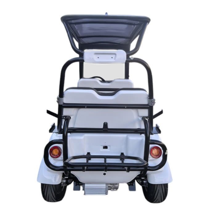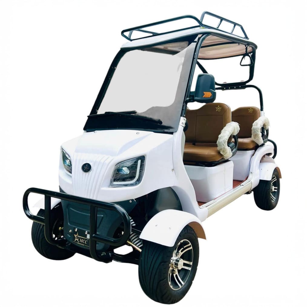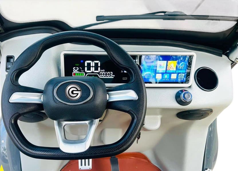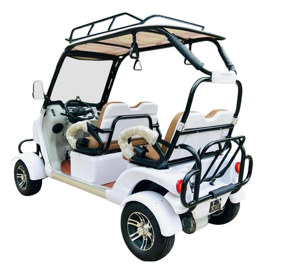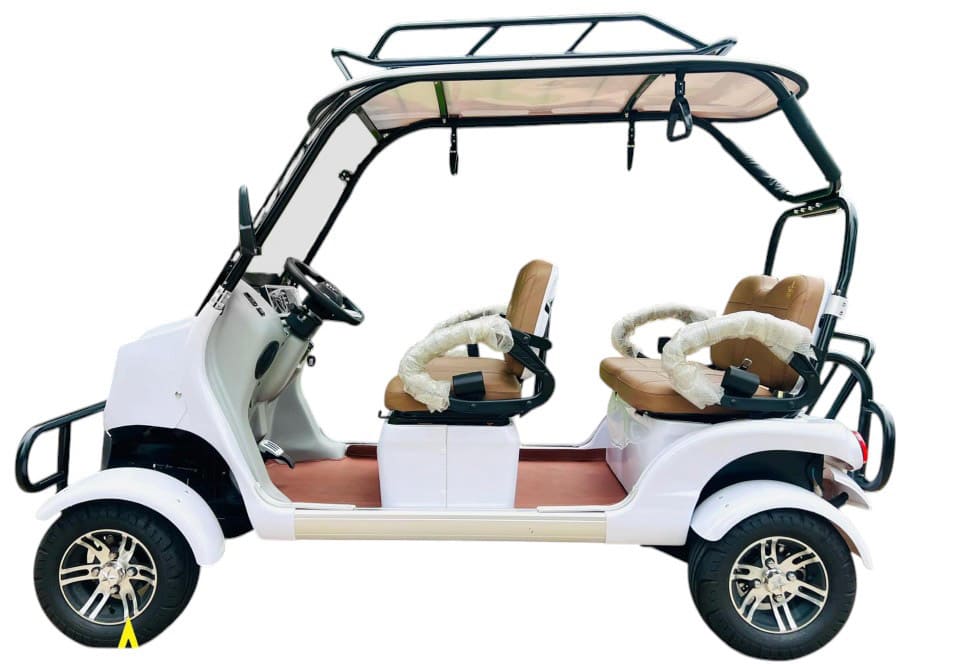 Гольфкар рассчитан на максимальную нагрузку до 400 кг и оснащён двумя рядами сидений, обеспечивающими удобную посадку для четырёх человек. На приборной панели установлен LED спидометр, а конструкция включает дифференциал в трансмиссии, что обеспечивает плавные повороты и высокую маневренность. Колёса установлены на литых алюминиевых дисках R10 с шинами 225/40-10', обеспечивающими отличное сцепление и долговечность.