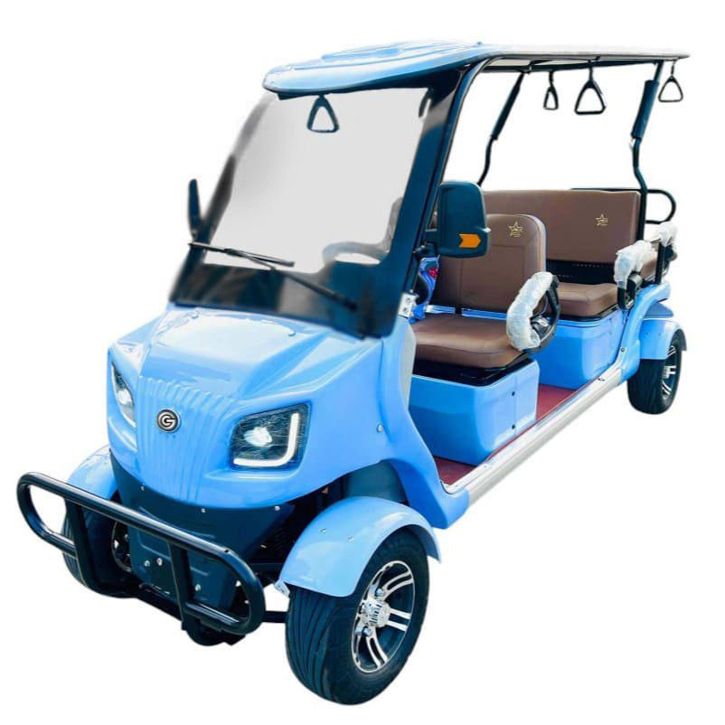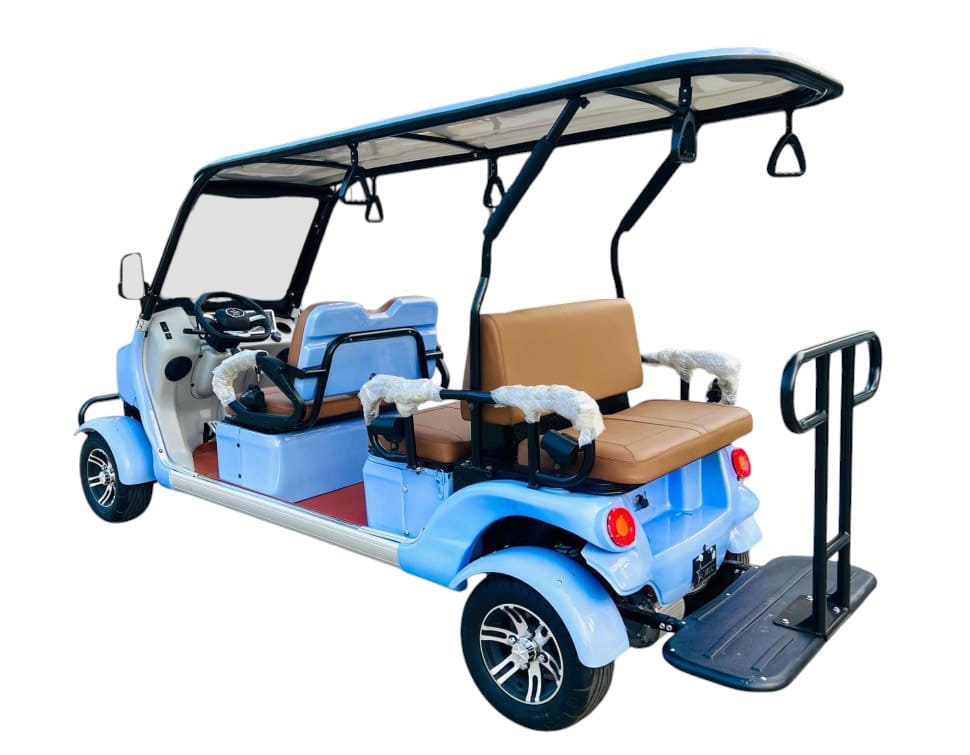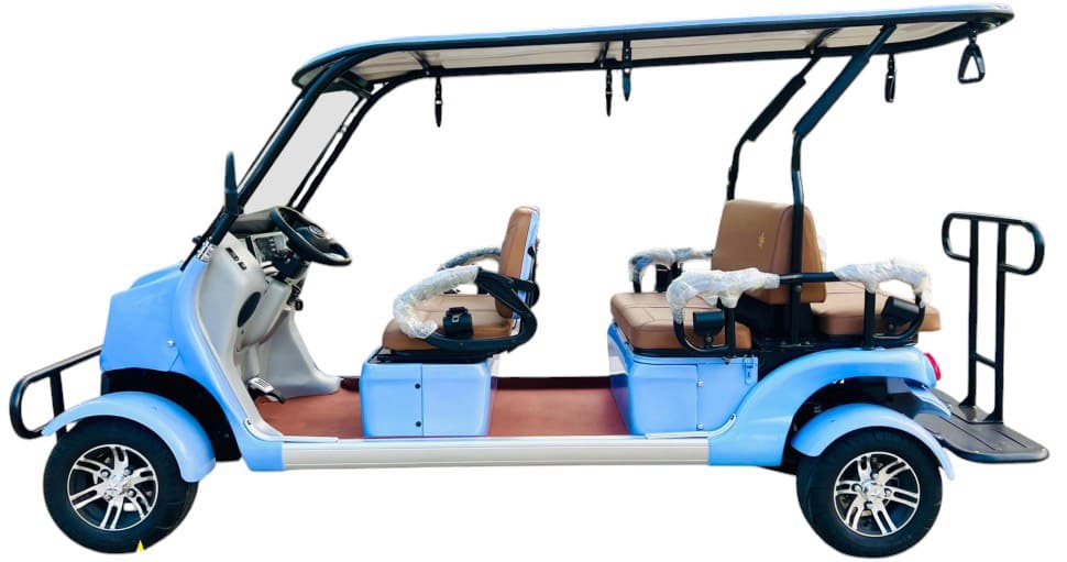 Гольфкар рассчитан на максимальную нагрузку до 450 кг и оснащён тремя рядами сидений, что позволяет разместить до шести пассажиров с удобством. На приборной панели установлен LED спидометр, а конструкция включает дифференциал для плавных поворотов и высокой маневренности. Длинная колёсная база — 1900 мм, дорожный просвет — 130 мм, а общая длина достигает 3040 мм, что обеспечивает исключительную устойчивость и простор внутри салона.