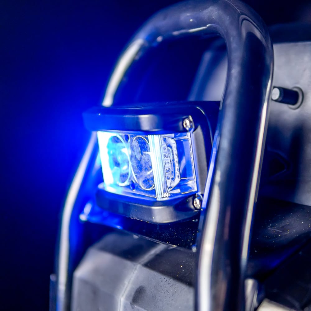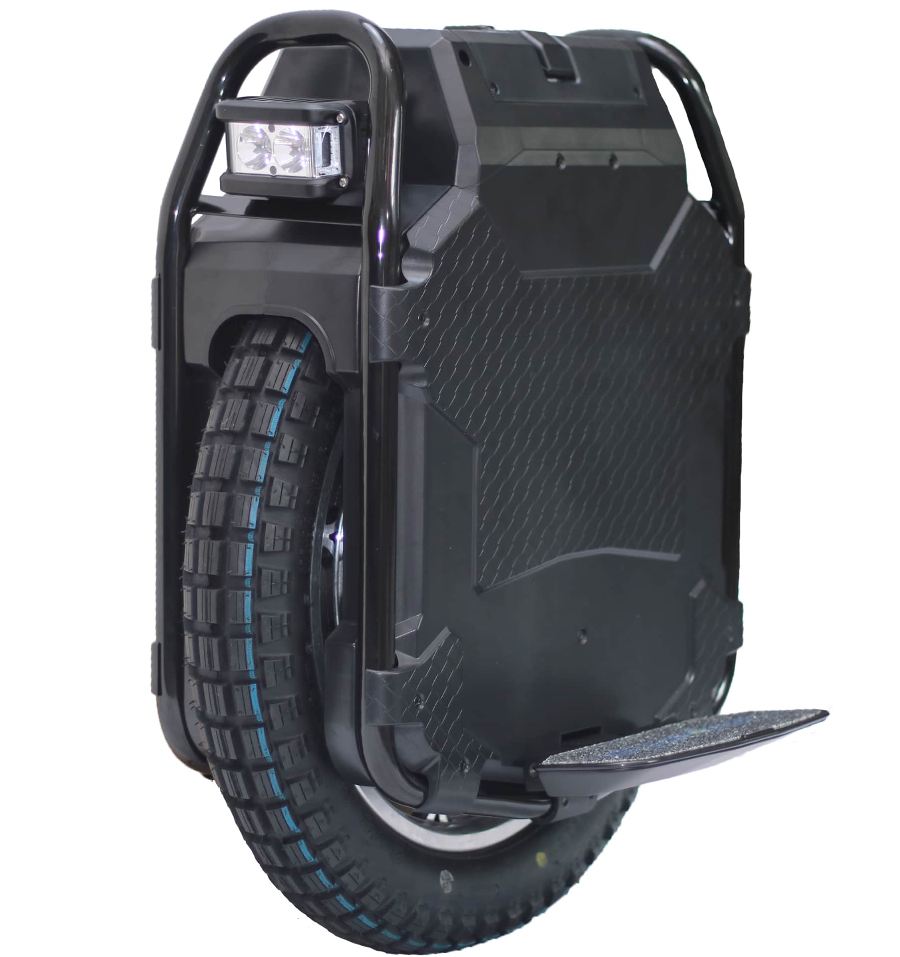 Эргономичные подножки снабжены качественным покрытием и предоставляют удобство при стоянии и движении. Для улучшенной компактности во время транспортировки подножки складываются и фиксируются магнитами, а размер педалей составляет 250 x 130 мм, с высотой от земли 170 мм. Яркая фара мощностью 8 Вт расположена спереди моноколеса, а также предусмотрен режим "стробоскоп", при котором фара мерцает синим светом по боковым секциям. ЖК-дисплей обеспечивает мониторинг основных параметров и управление функциями моноколеса. На экране отображаются скорость, напряжение, пробег, состояние аккумулятора и многое другое. Дополнительно, можно регулировать режим жесткости, поднимать педали и многое другое. Дисплей устойчив к бликованию на солнце и хорошо виден в темное время благодаря подсветке.