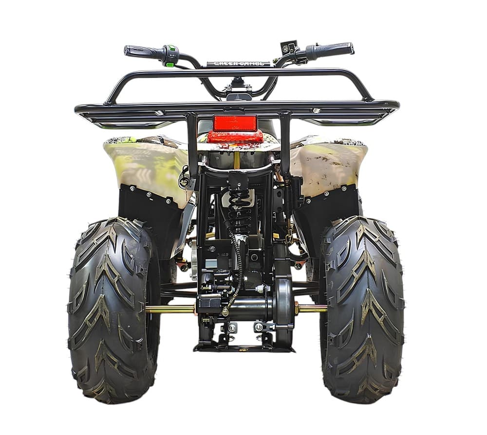 Удобное расположение органов управления на руле делает эксплуатацию интуитивно понятной: ручка газа, кнопки заднего хода и включения фары, а также информативный спидометр с индикатором заряда находятся под рукой. Задний багажник предоставляет дополнительное пространство для перевозки мелких предметов, что особенно актуально во время длительных поездок. Благодаря продуманной эргономике и качественным компонентам, квадроцикл обеспечивает безопасное и комфортное управление.