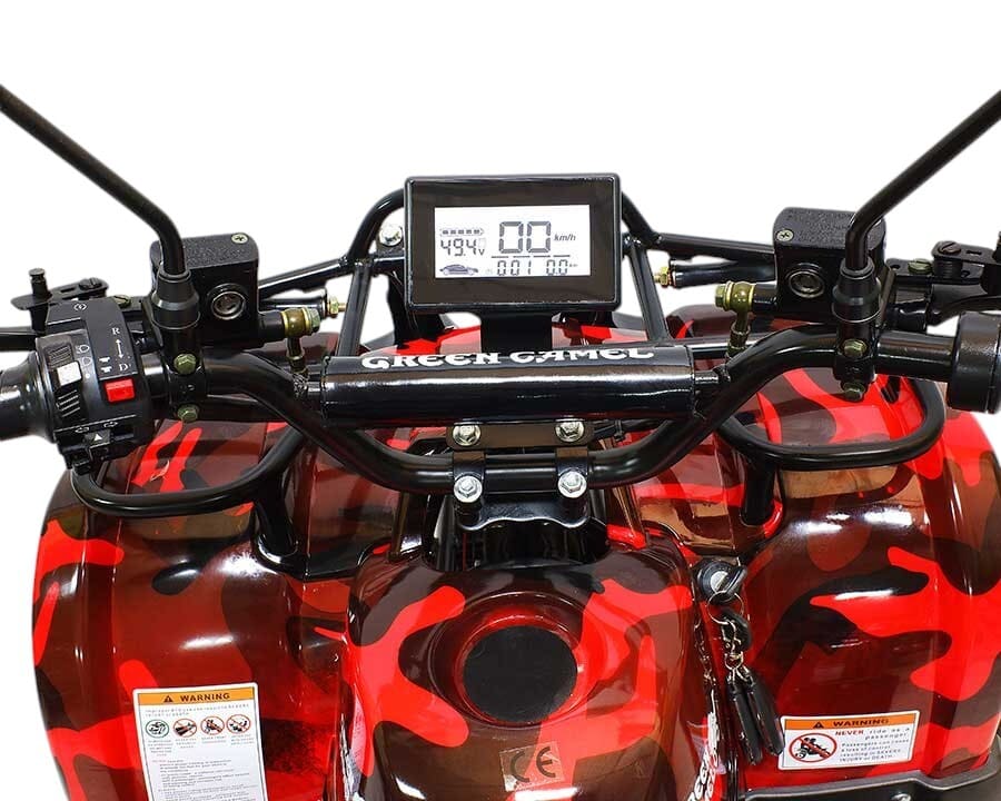 GreenCamel Атакама T120 - мощный электрический квадроцикл, созданный для активного отдыха и длительных поездок. Бесщеточный двигатель BLDC мощностью 800 Вт и напряжением 48V обеспечивают максимальную скорость до 30 км/ч, а гидравлические дисковые тормоза спереди и сзади гарантируют надежное торможение в любых условиях. Модель способна выдерживать нагрузку до 120 кг, что делает ее подходящей как для детей, так и для взрослых.