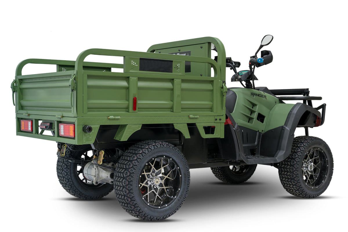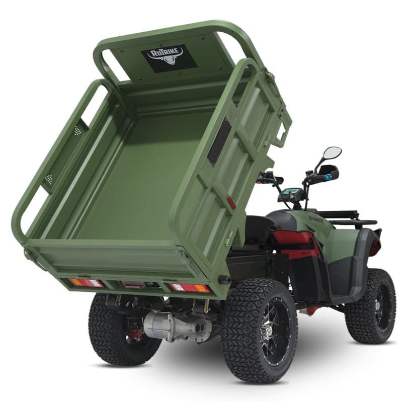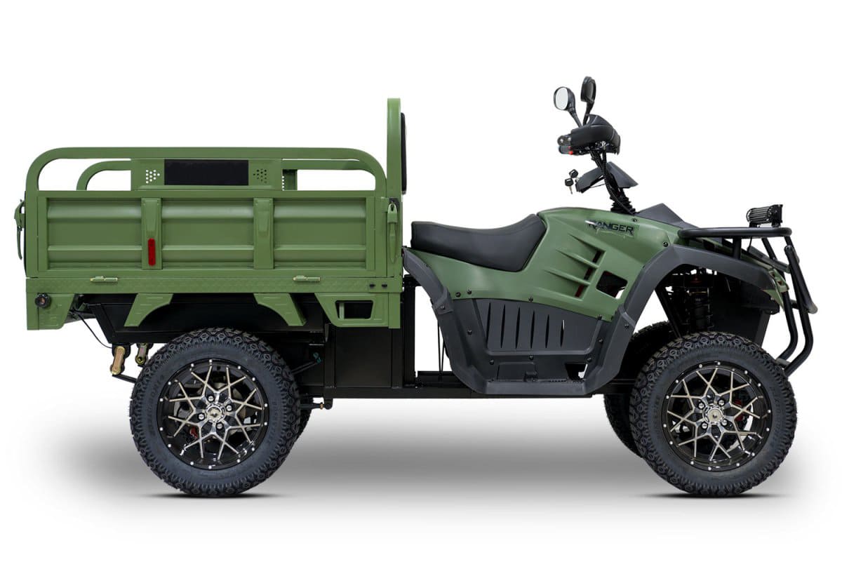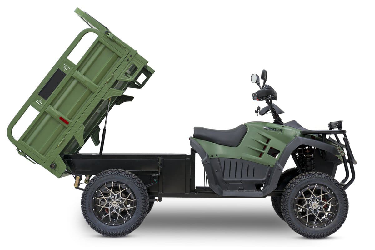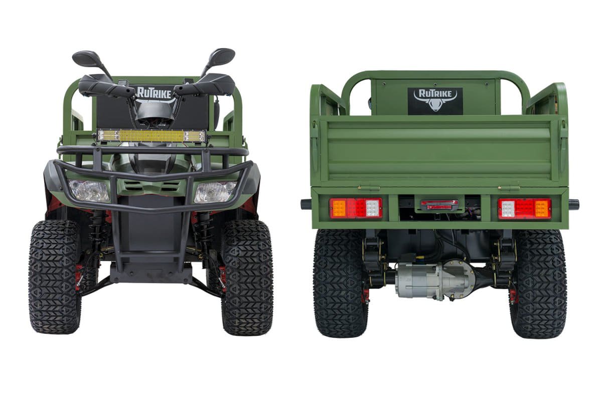 Rutrike Рейнджер — это профессиональный грузовой электроквадроцикл, созданный для интенсивной работы в условиях строительства, сельского хозяйства и промышленных объектов. Оснащённый синхронным электродвигателем мощностью 3000 Вт, он обеспечивает стабильную тягу при максимальной нагрузке до 700 кг и преодолевает уклоны до 15°. Аккумуляторная система 60 В поддерживает выбор между AGM, GEL или LiFePO4-батареями, обеспечивая запас хода до 100 км. Полная зарядка занимает 10 часов, а задний привод гарантирует простоту обслуживания и надёжность на грунтовых дорогах.