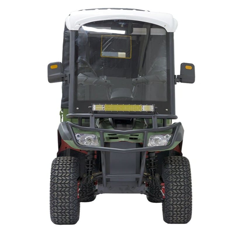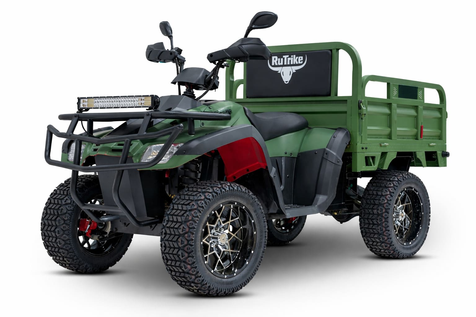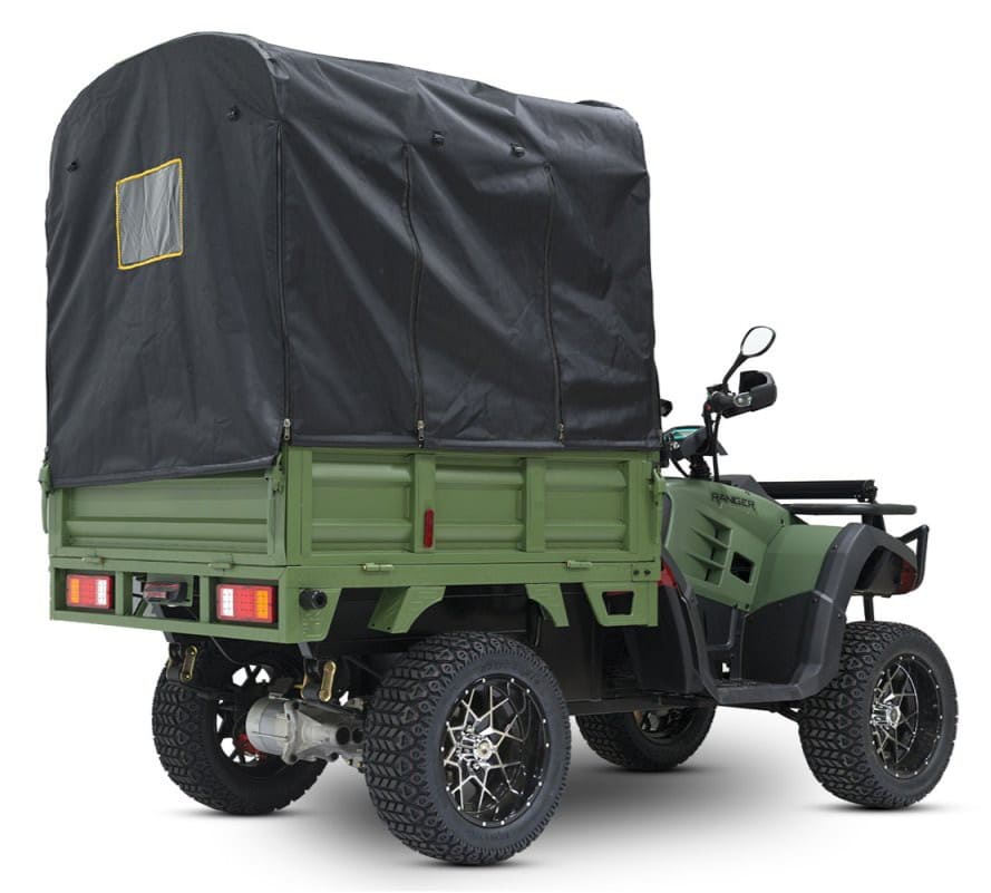 Конструкция квадроцикла сочетает прочность и функциональность: общий вес составляет 320 кг, а габариты — 2860×1100×1400 мм. Для комфорта и проходимости установлены 23-дюймовые колёса с внедорожным протектором, рычажная передняя подвеска с амортизацией и задние рессоры (4 листа), выдерживающие экстремальные нагрузки. Грузовой отсек размером 1290×1100×450 мм позволяет перевозить стройматериалы, урожай или оборудование, а трёхрежимная система управления адаптирует скорость под задачи — от экономичного передвижения до мощного режима для сложных участков.