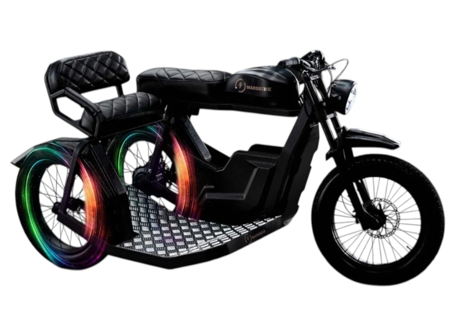 MARS BIKE ULTRA PLUS WD — это усовершенствованная версия электромотоцикла с системой полного привода, созданная для максимальной проходимости и высокой грузоподъёмности. Оснащённый двумя двигателями общей мощностью 1800 Вт, он обеспечивает уверенную тягу даже на подъёмах и в сложных дорожных условиях. Максимальная скорость ограничена на уровне 45 км/ч, а запас хода достигает 80 км благодаря аккумулятору 48 В / 35 000 мА·ч. Полная зарядка занимает всего 4 часа.