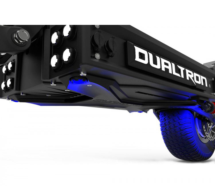 Первый самокат Dualtron с неэластомерной подвеской. Подвеска является настраиваемой - настройка жесткости/мягкости работы подвески выполняется крутящимся барашком на корпусе переднего и заднего аммортизаторов. Можно быстро изменить настройки аммортизатора при изменении дорожного покрытия во время поездки, например - для езды по ровному асфальту делаем аммортизаторы более жесткими, а при езде по пересеченной местности, наоборот - смягчаем работу подвески.