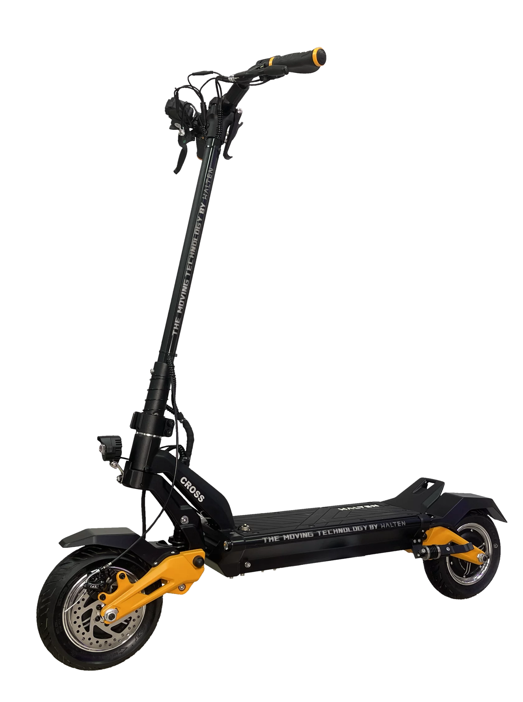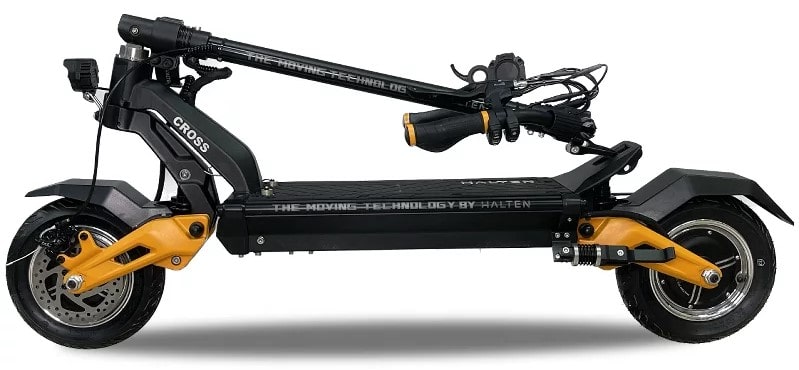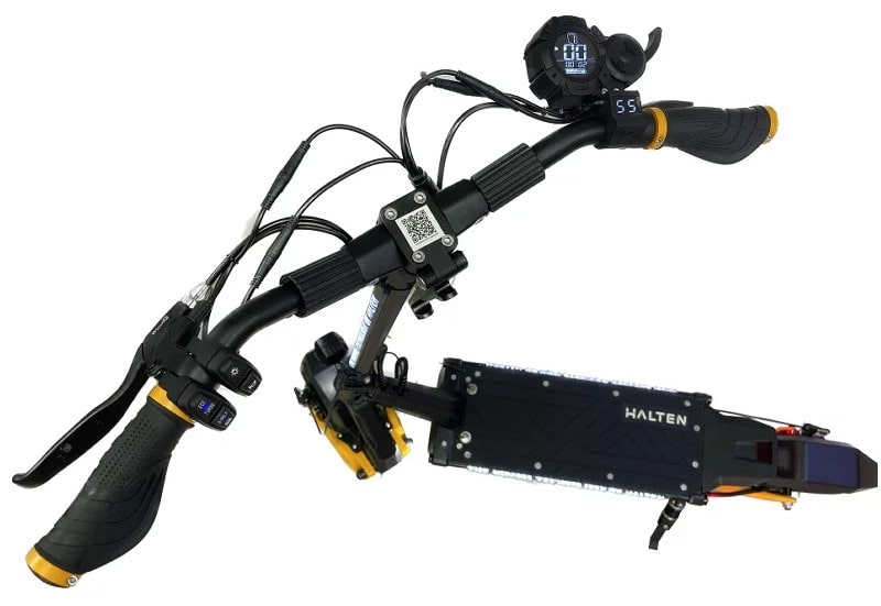 Электросамокат Halten Cross V.3 2wd достигает скорости 55 км/ч и успешно проезжает до 50 км на одной зарядке батареи емкостью 52 В и 18,2 Ач.