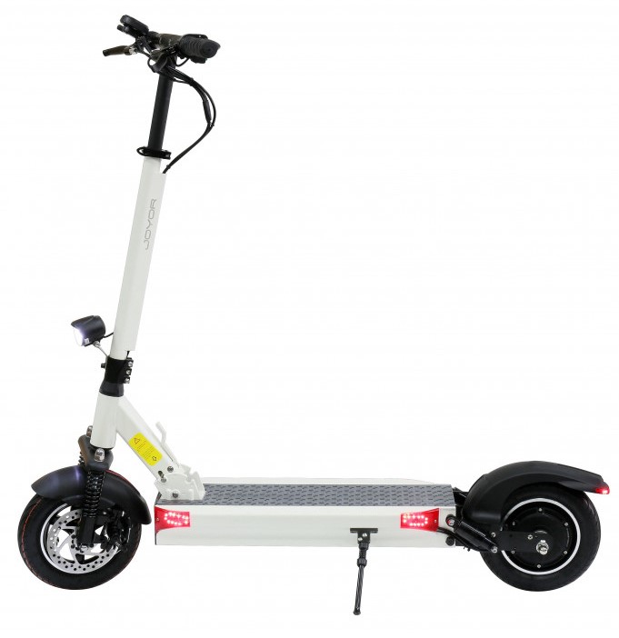 Подвеска электросамоката Joyor Y5S позволяет ездить даже по бездорожью, не ощущая особой тряски. А все благодаря передним и задним амортизаторам (основное отличие от X5S), которые поглощают вибрацию. Большие десятидюймовые колеса, образуют высокий клиренс. Чтобы оставить его в вертикальном положении, можно воспользоваться специальной парковочной подножкой.