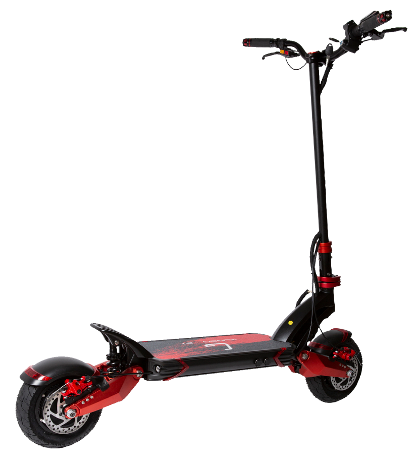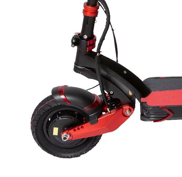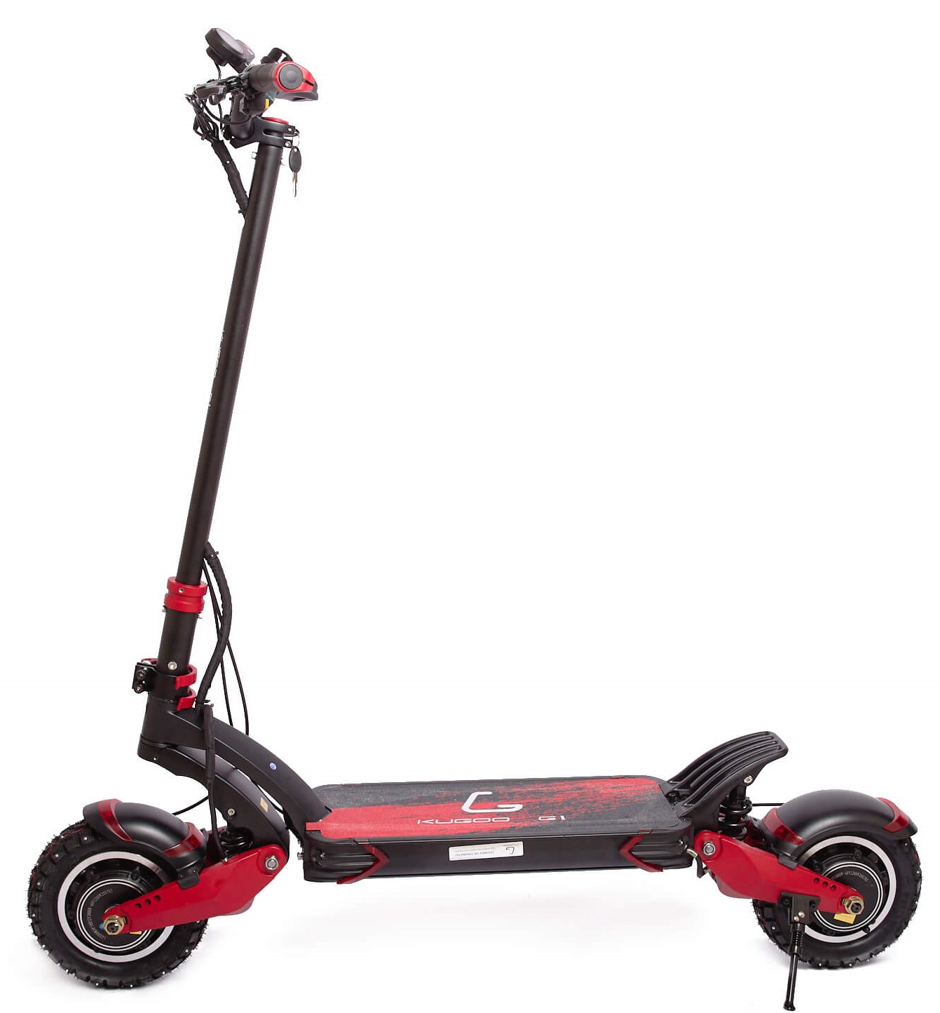 Самокат Kugoo G1 оснащен 10-дюймовыми колесами с внедорожными шинами и рельефным протектором, что значительно улучшает его проходимость. Для передвижения по неровной местности производители предусмотрели хорошую амортизацию переднего и заднего колес. Этот агрегат также имеет складную конструкцию, и рулевая стойка может быть опущена к деке для удобства хранения и транспортировки.