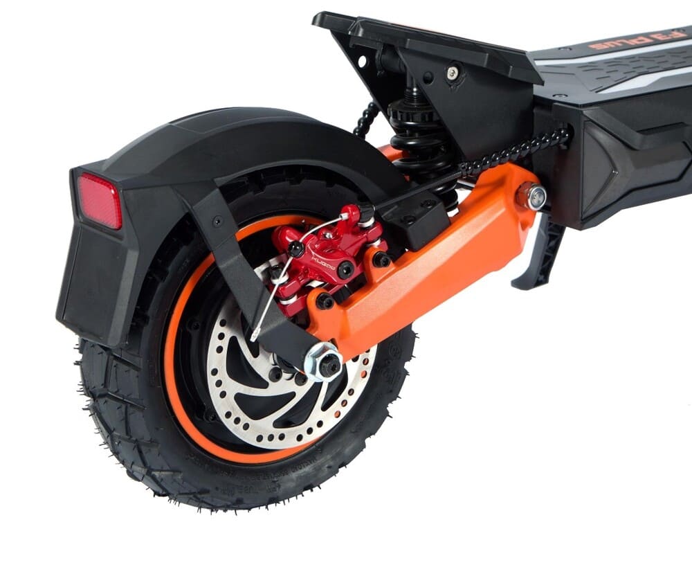 Самокат оборудован колесами диаметром 10 дюймов, обеспечивающими устойчивость и уверенное сцепление с дорогой. Также в конструкции установлены передний и задний амортизаторы, что делает поездки комфортными даже по неровным поверхностям. Устройство способно преодолевать уклоны до 25°, что говорит о его хорошей проходимости и универсальности.