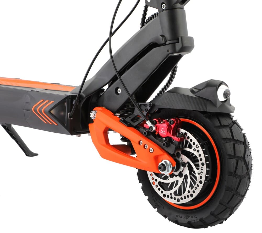 Электросамокат оснащён передней и задней гидравлической амортизацией, что делает поездку комфортной даже на неровных дорогах и грунтовых участках. Тормозная система — дисковые гидравлические тормоза спереди и сзади — гарантирует мощное и точное торможение в любых погодных условиях. Колёса диаметром 10 дюймов обеспечивают отличную проходимость и устойчивость на высокой скорости.